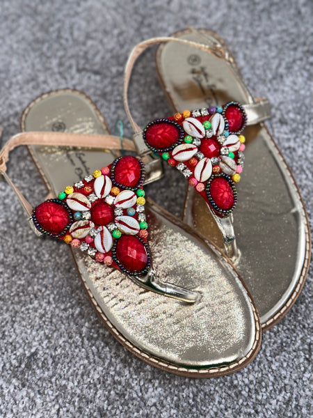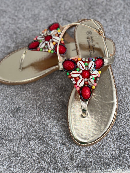 Red Multicoloured Embellished Sandals