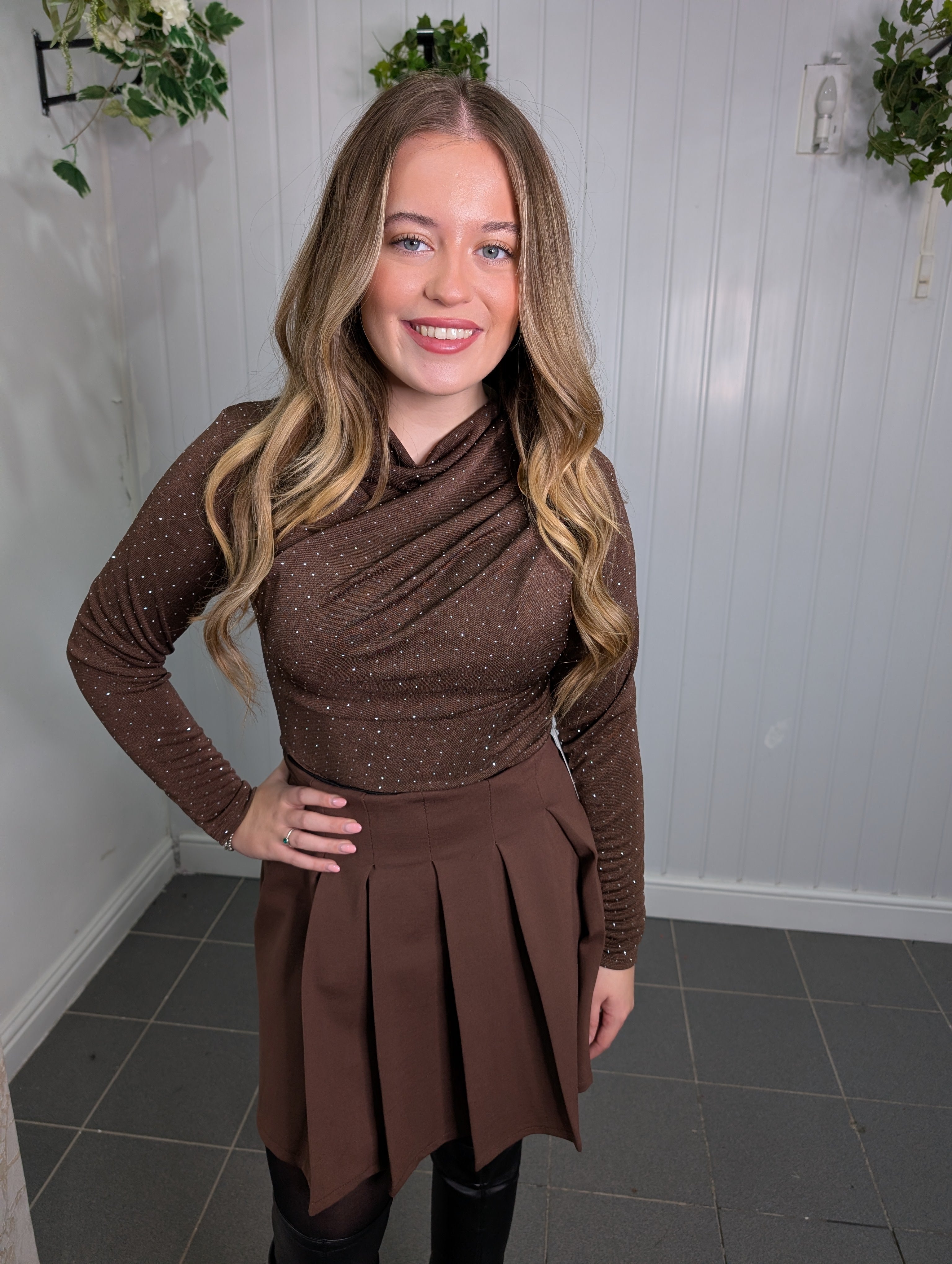 Elevate your wardrobe with this pleated skirt designed to combine classic elegance with subtle detailing. it has an elasticated waist band. Also available in Plain black and Brown and Beige.