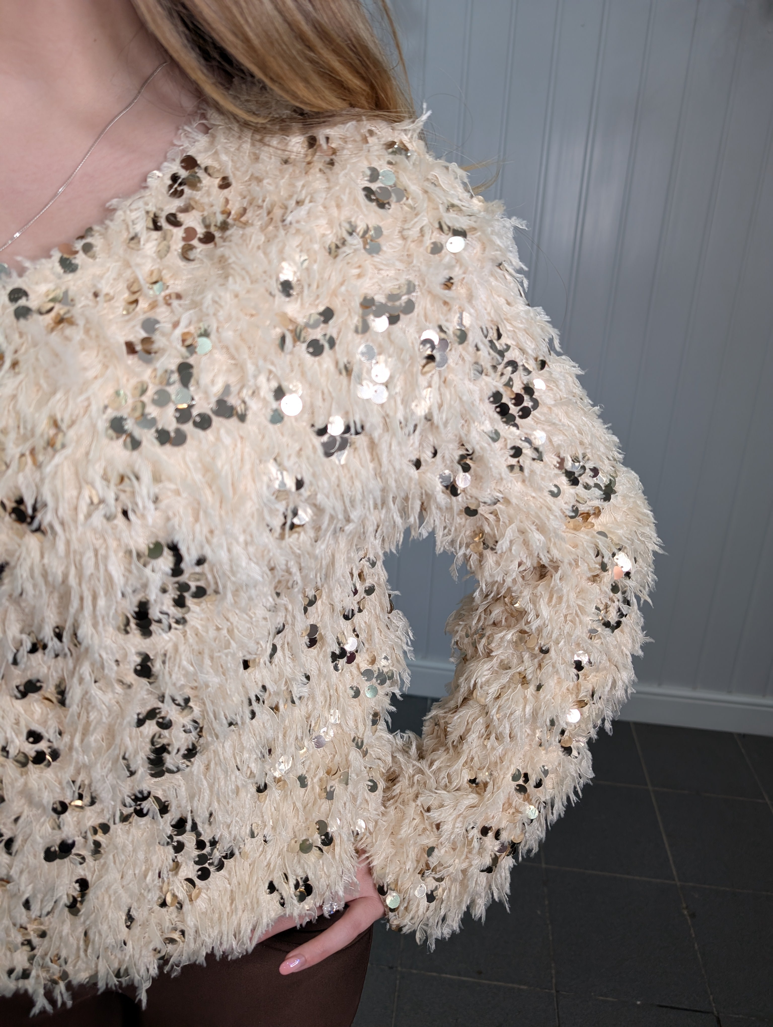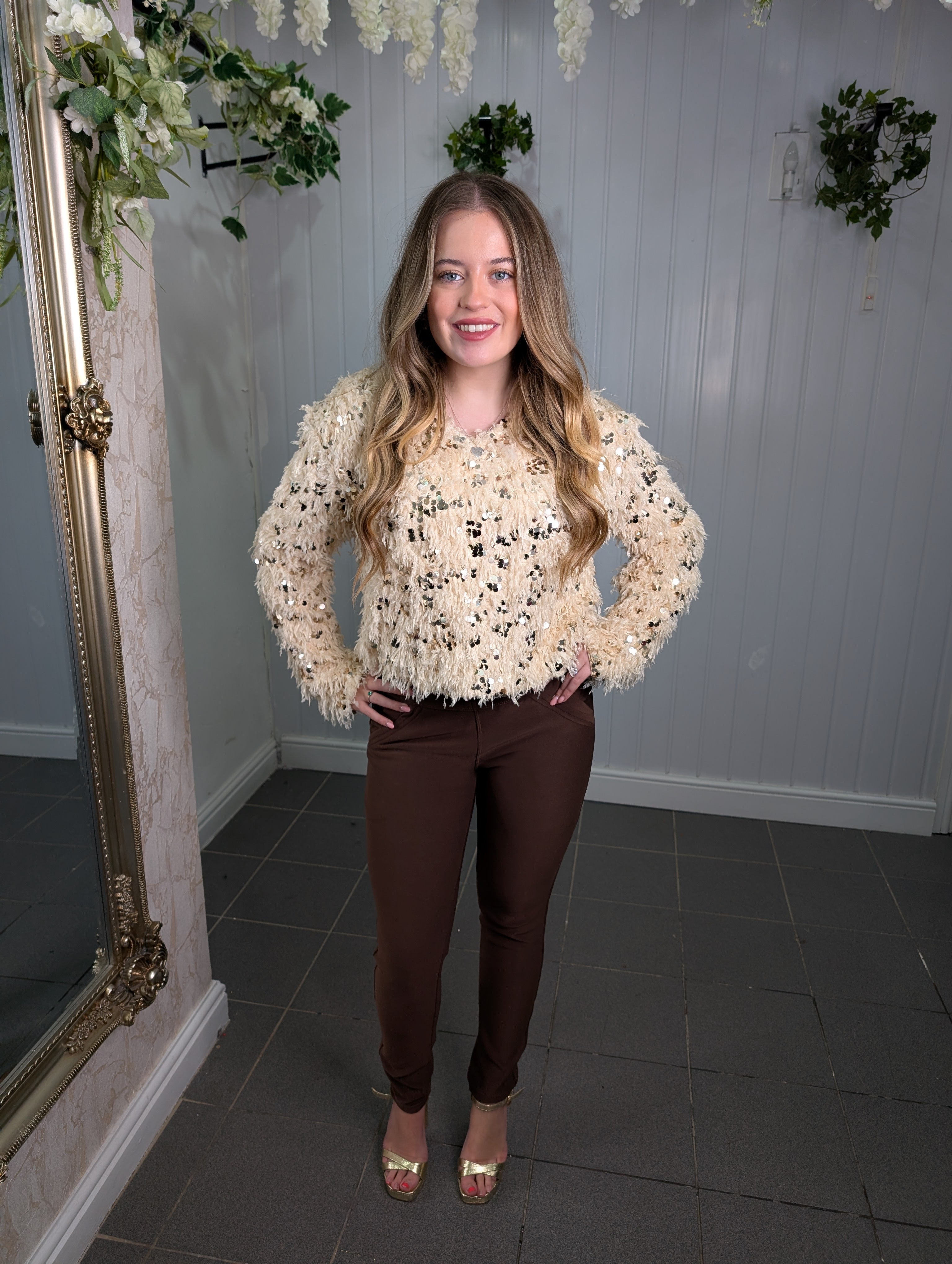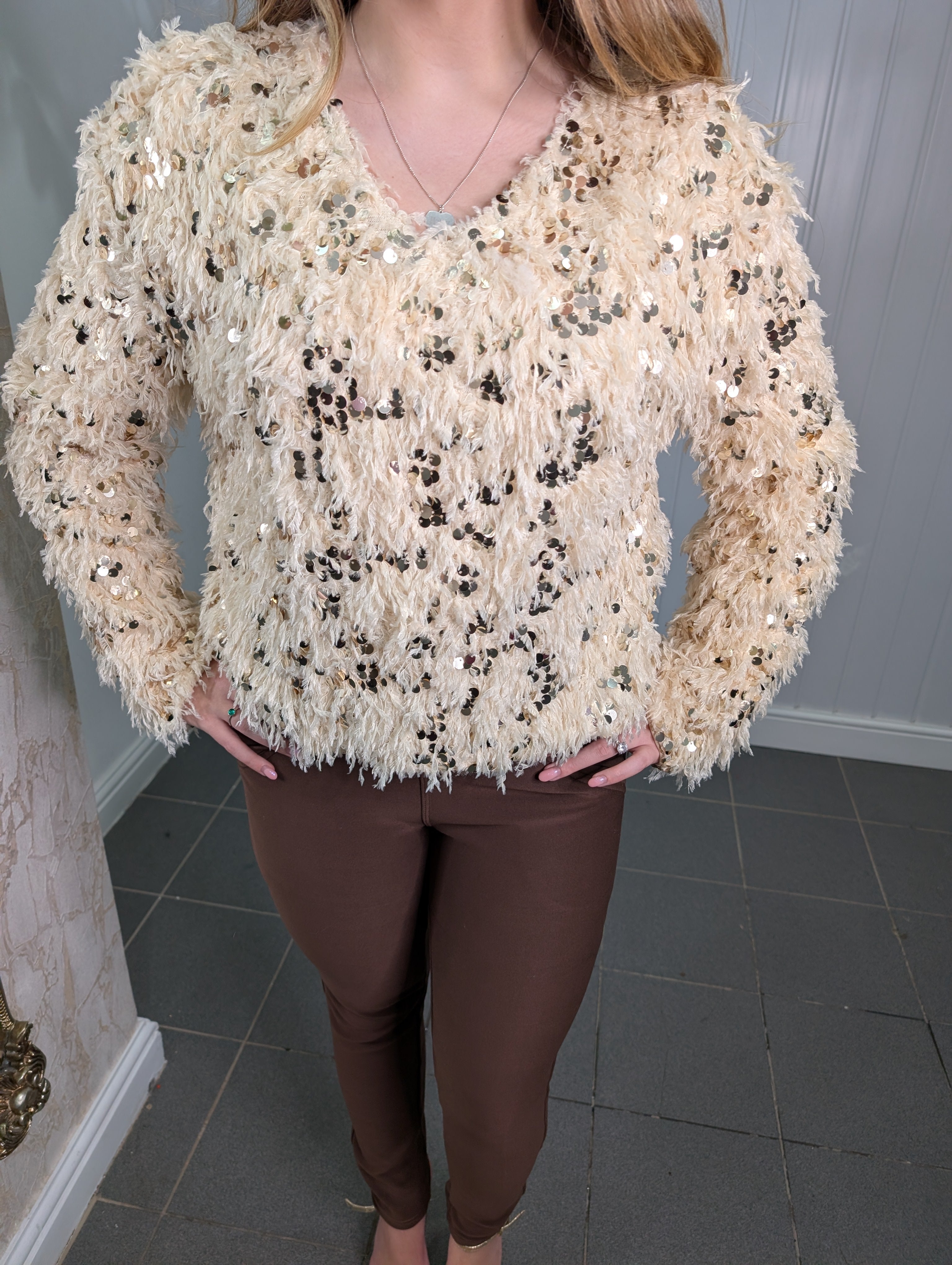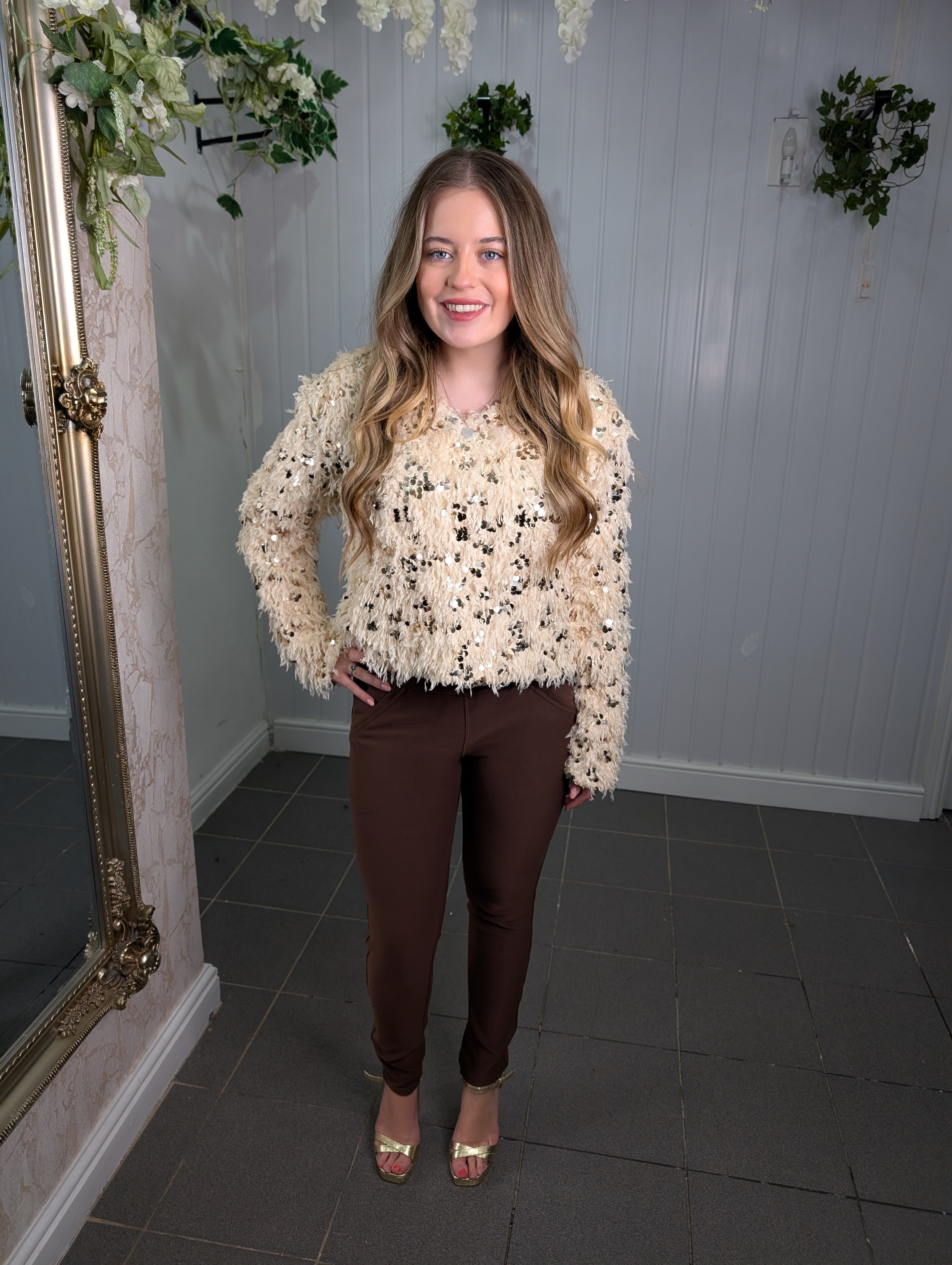Elevate your knitwear collection with this sophisticated cream sequin and feather jumper. The delicate sequin detailing catches light beautifully, while strategically placed feather accents add textural depth and movement. Crafted for those who appreciate refined embellishment, this piece transitions seamlessly from casual daywear to evening occasions. The neutral cream palette ensures versatile styling with your existing wardrobe, making it an investment piece that delivers both visual impact and wearability.