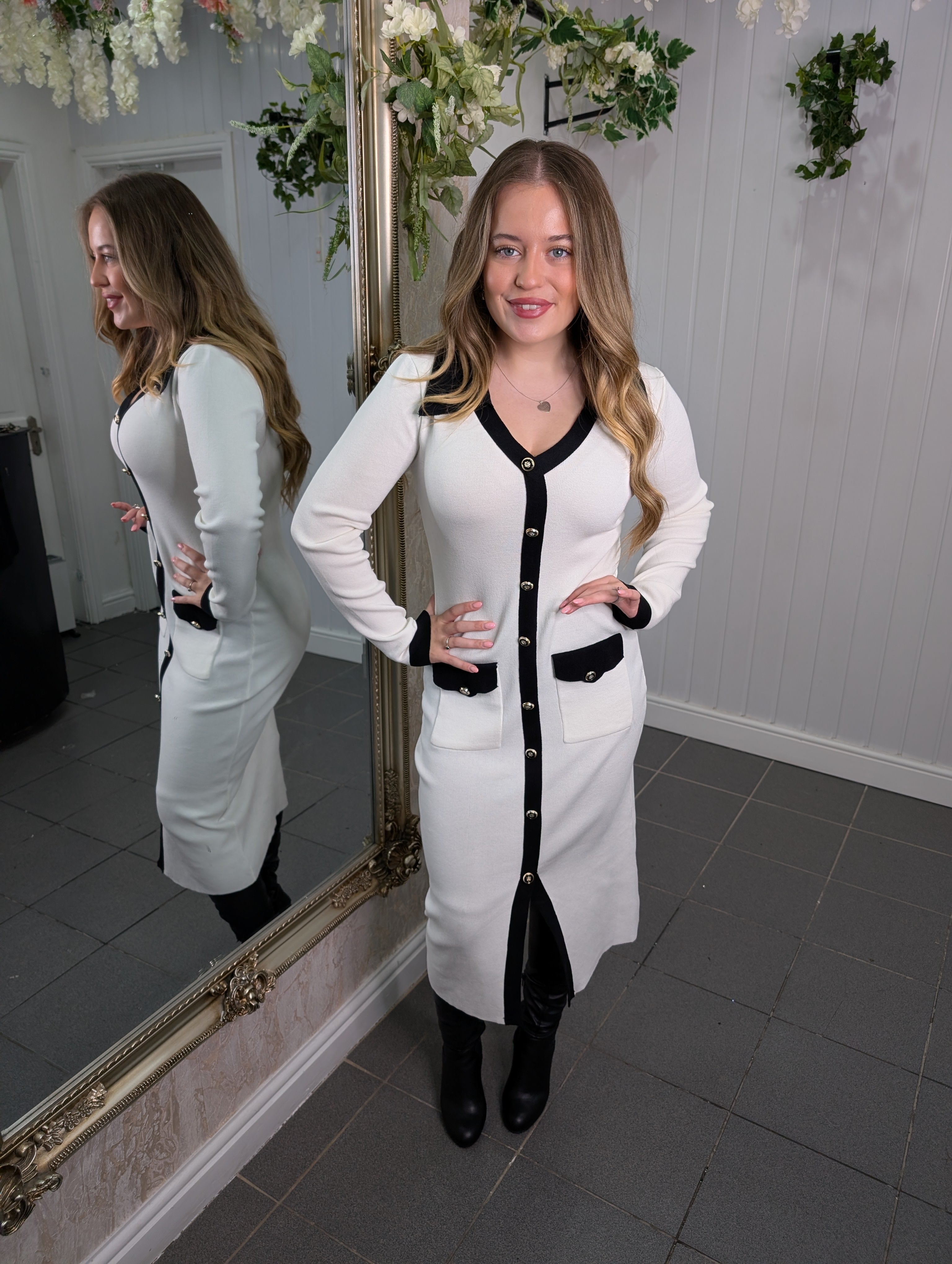 Elevate your everyday wardrobe with this sophisticated black and cream button knitted dress. Crafted from quality knit fabric, this piece seamlessly transitions from office to evening with its timeless colour-block design. The functional button front adds both visual interest and practical styling versatility, allowing you to adjust the fit to your preference. The classic silhouette flatters various body types whilst the neutral palette pairs effortlessly with your existing accessories. A refined choice for those who appreciate understated elegance and enduring style.