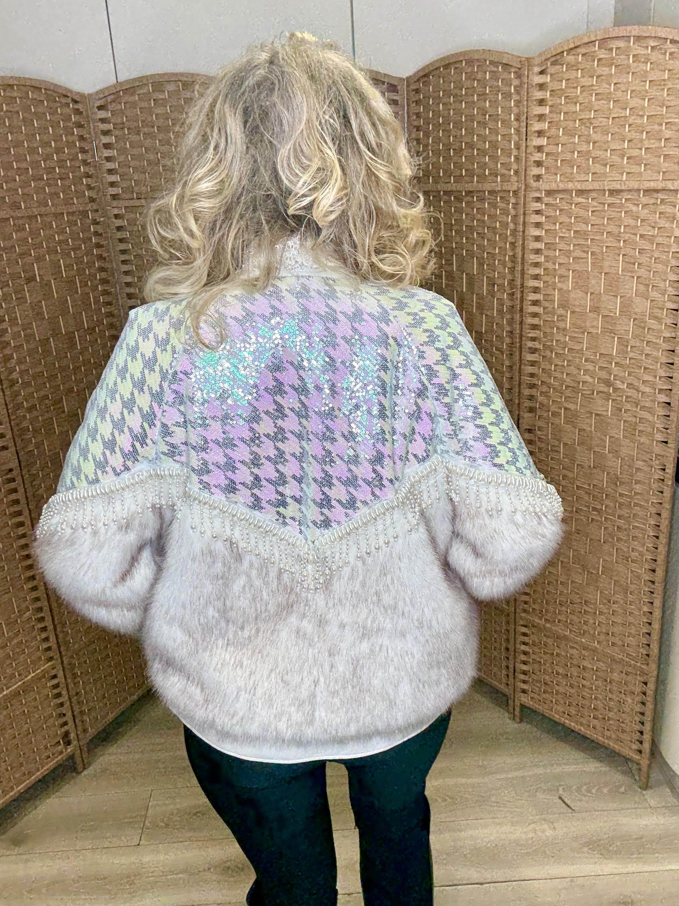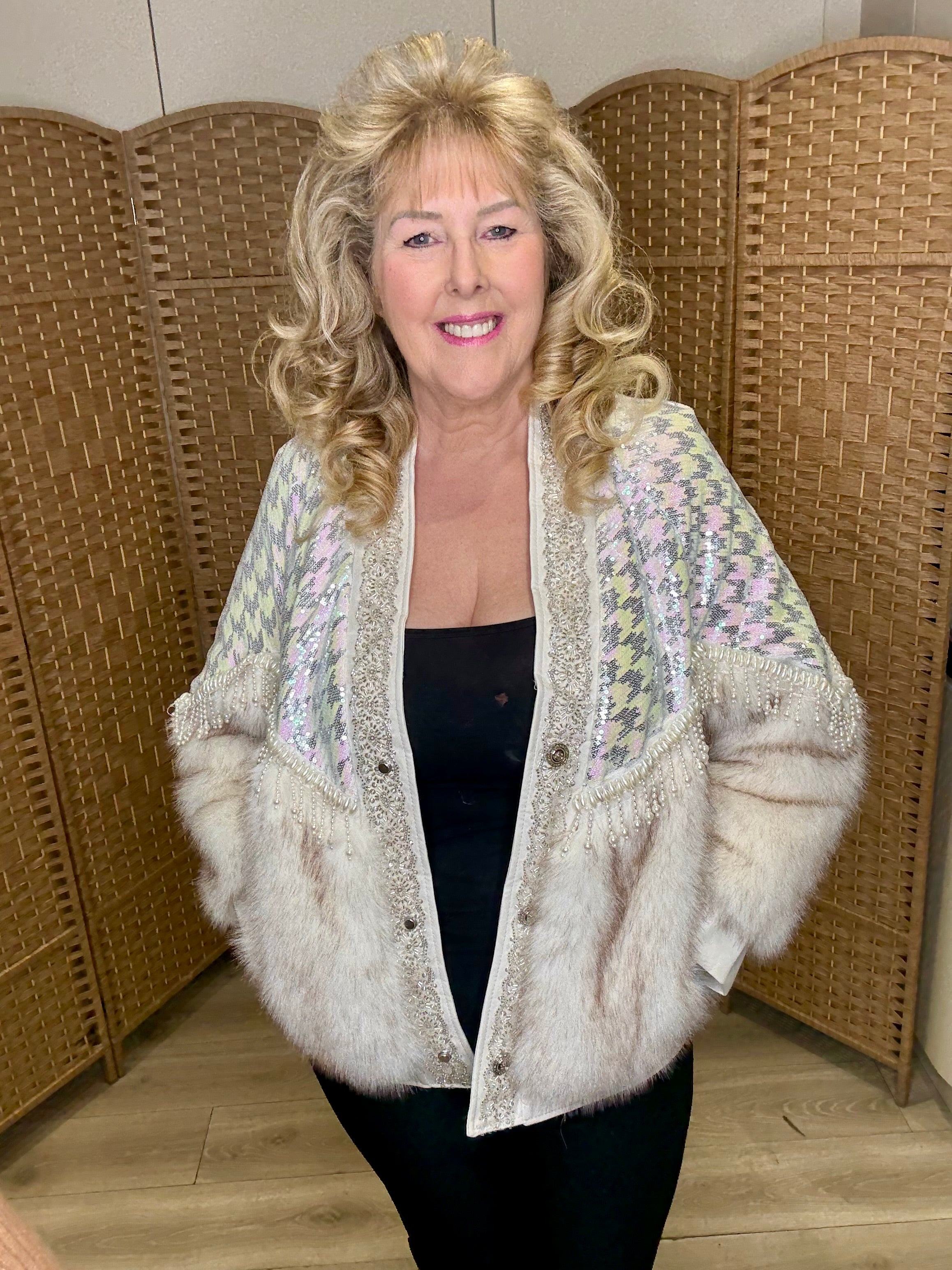 Cream Iridescent Embellished Beaded Faux Fur Coat