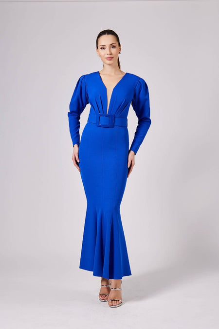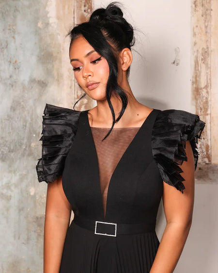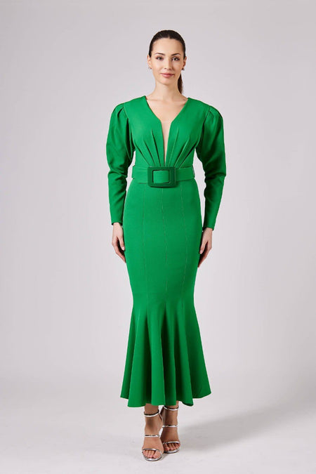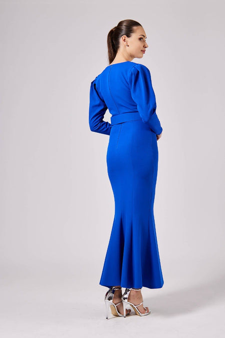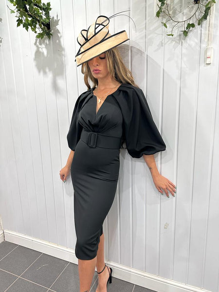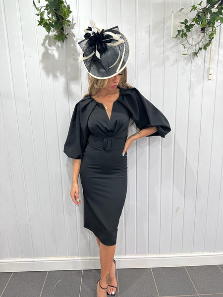 Rengin - Black Balloon Sleeve Fitted Midi Dress