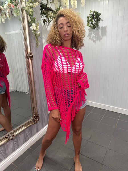 Fuchsia Crochet Asymmetrical Tassel Top