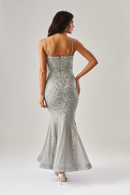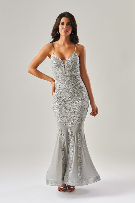 Forever Unique - Metallic Silver Grey Embroidered Fishtail Maxi Dress