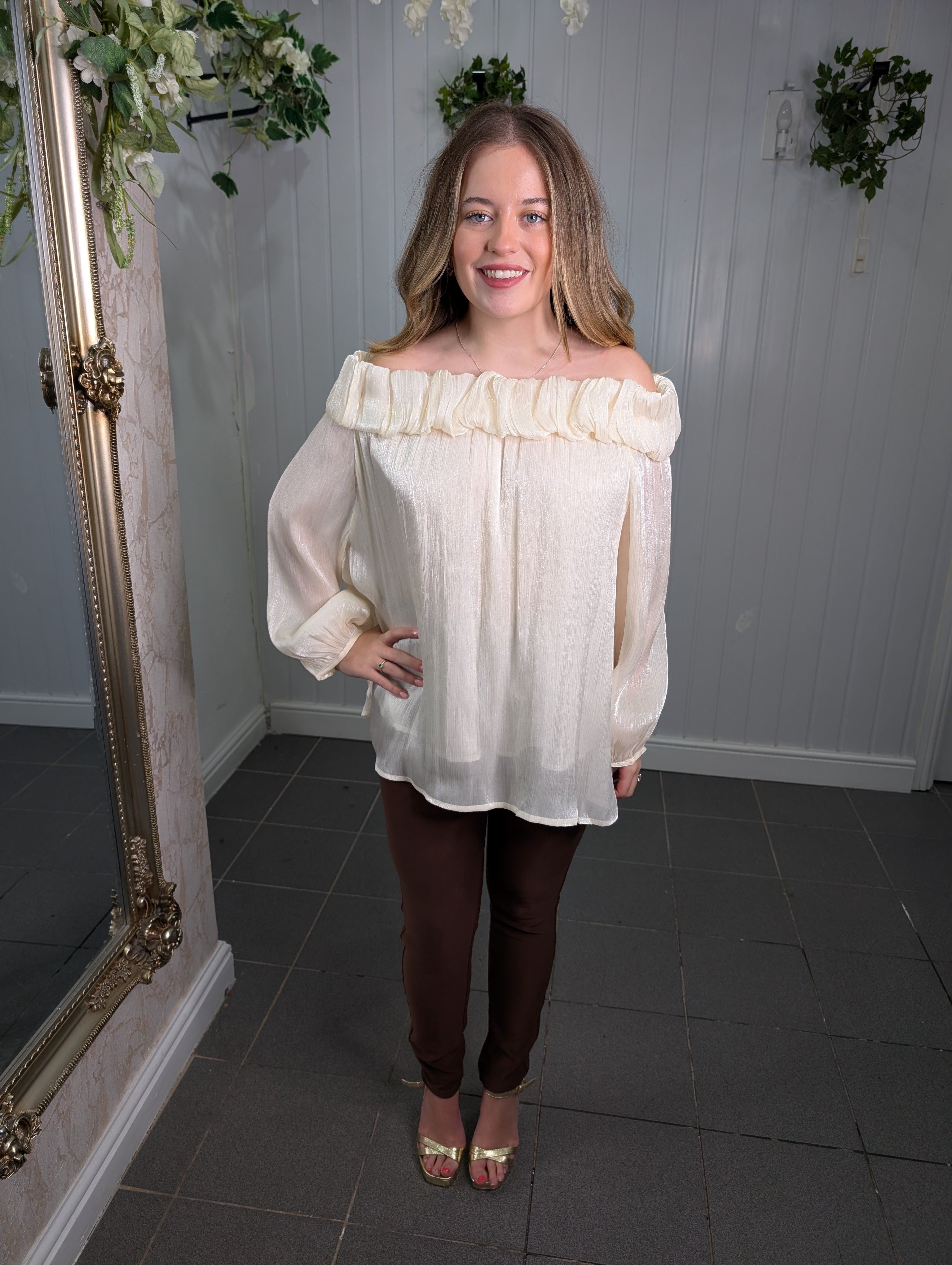 This cream shimmer top is a versatile and stylish addition to any wardrobe. The shimmery fabric adds a touch of glamour, while the cream color pairs well with any outfit. Made with high quality materials, this top offers both comfort and sophistication. Elevate your look with this must-have piece.
