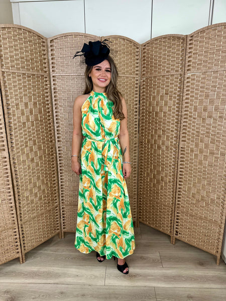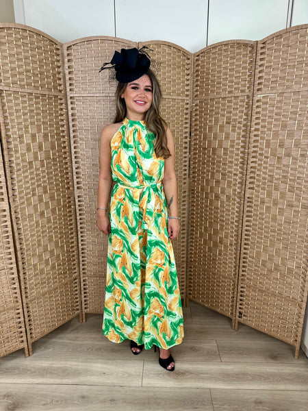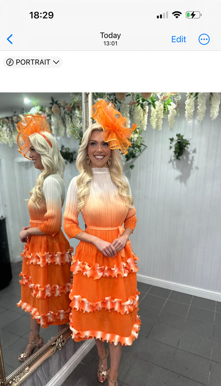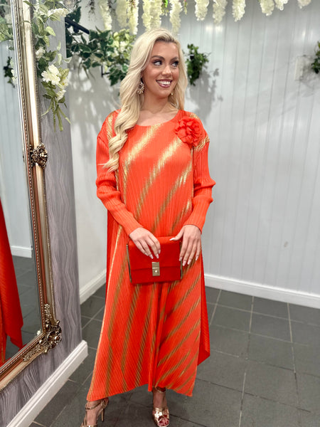Orange And Gold Shimmer Flower Pleated Midi Dress