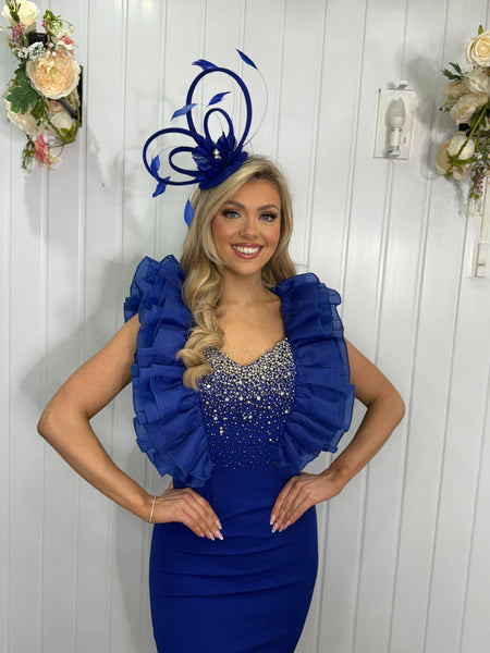 Bespoke handmade Royal Blue fascinator with Royal blue feathers, silver beads in the centre set on a elastic band with a clip to hold...