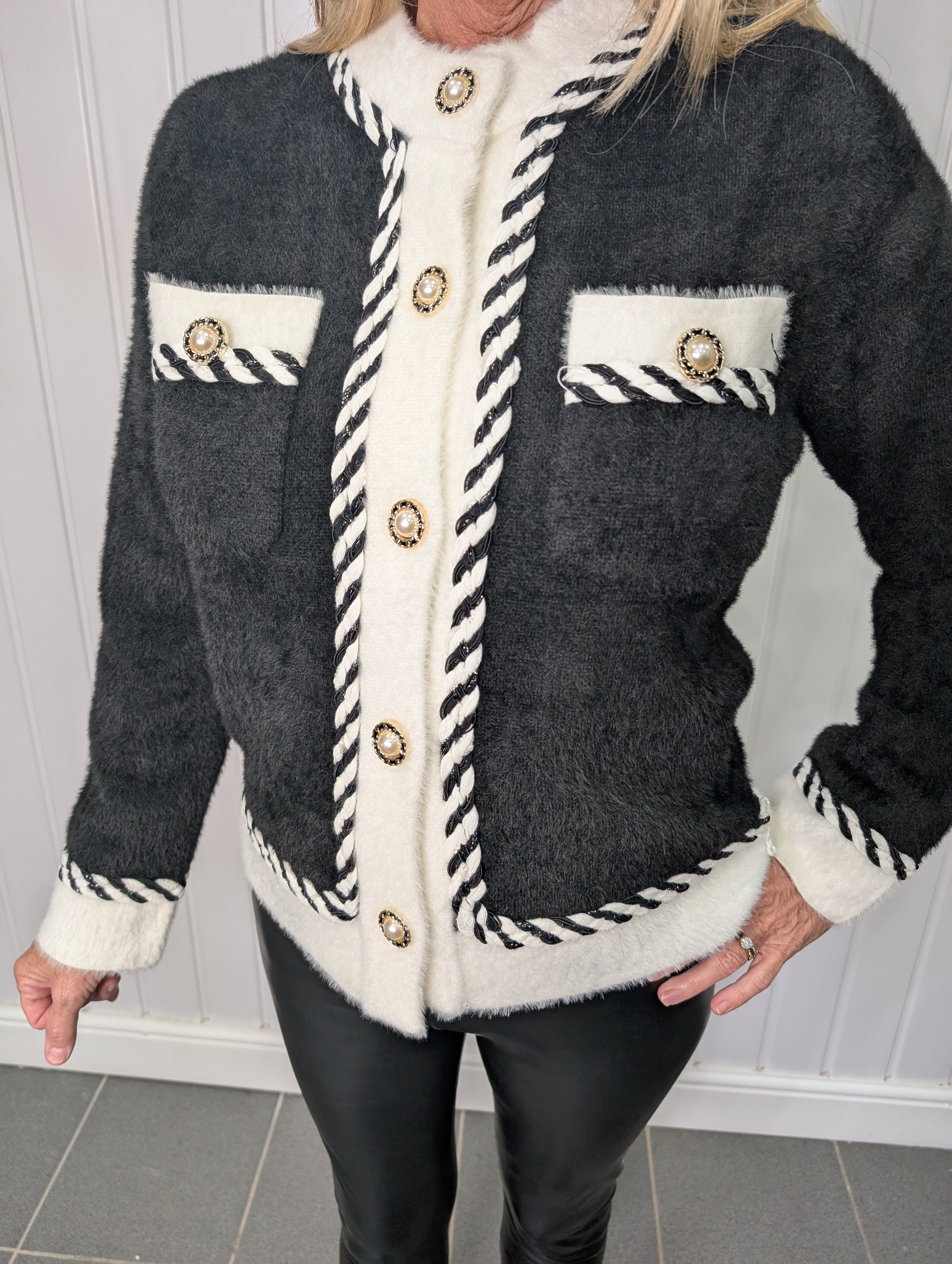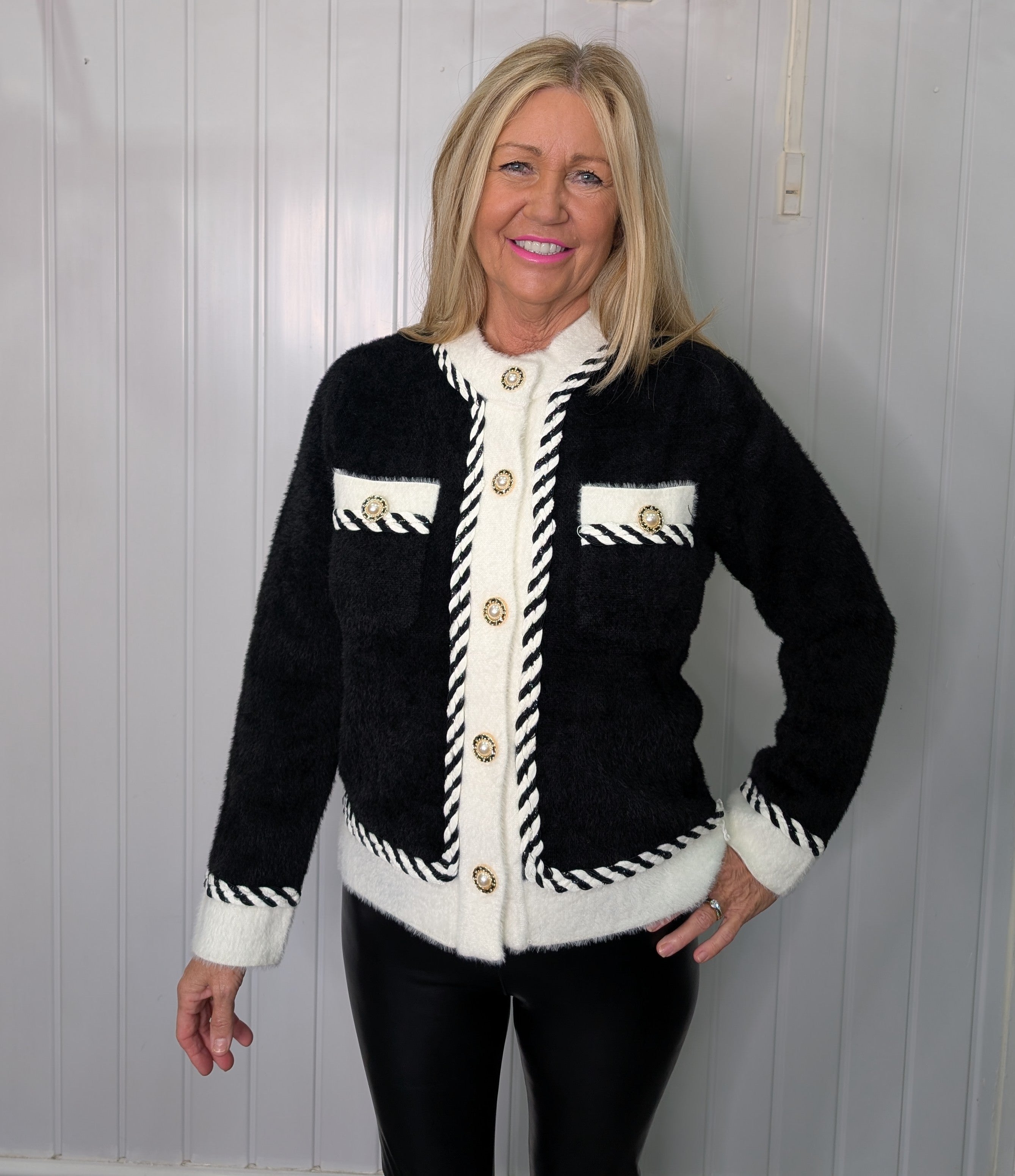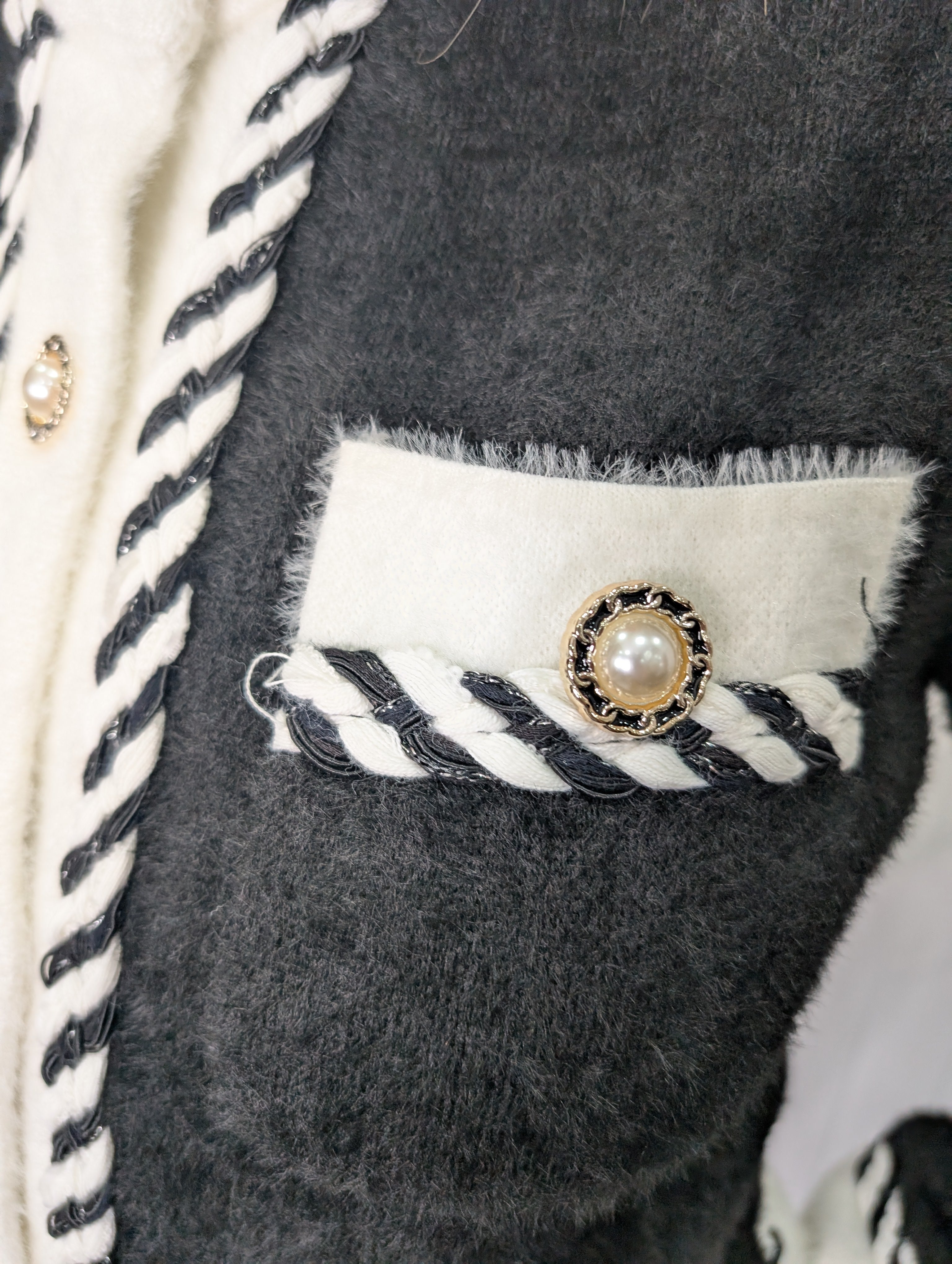 Crafted with a soft knit material and intricately woven, this cardigan adds a touch of elegance to any outfit. Its versatile design allows for effortless styling and its cozy fabric provides comfort all day long. A must-have for a stylish and chic wardrobe. Also available in white, pants available separately