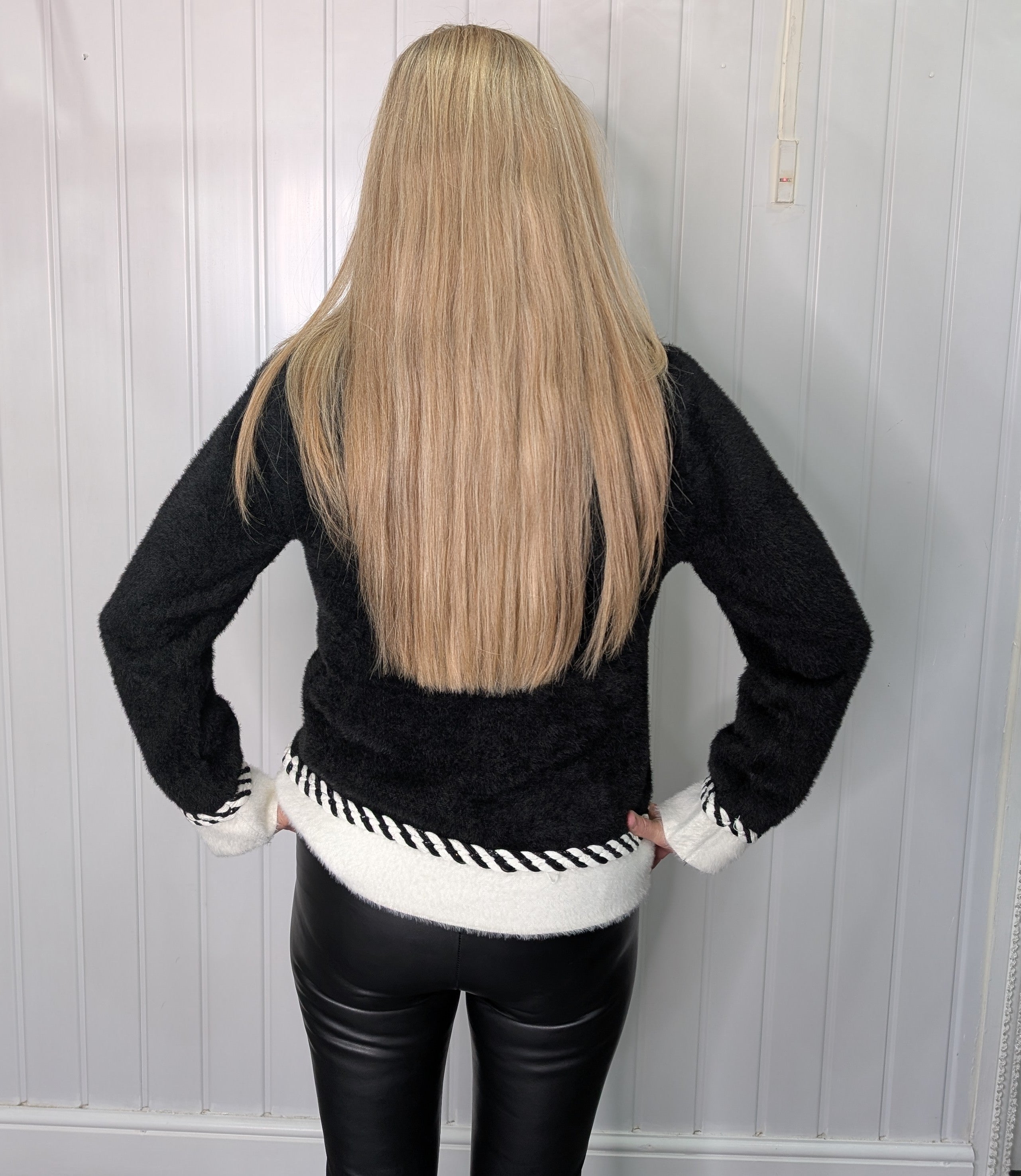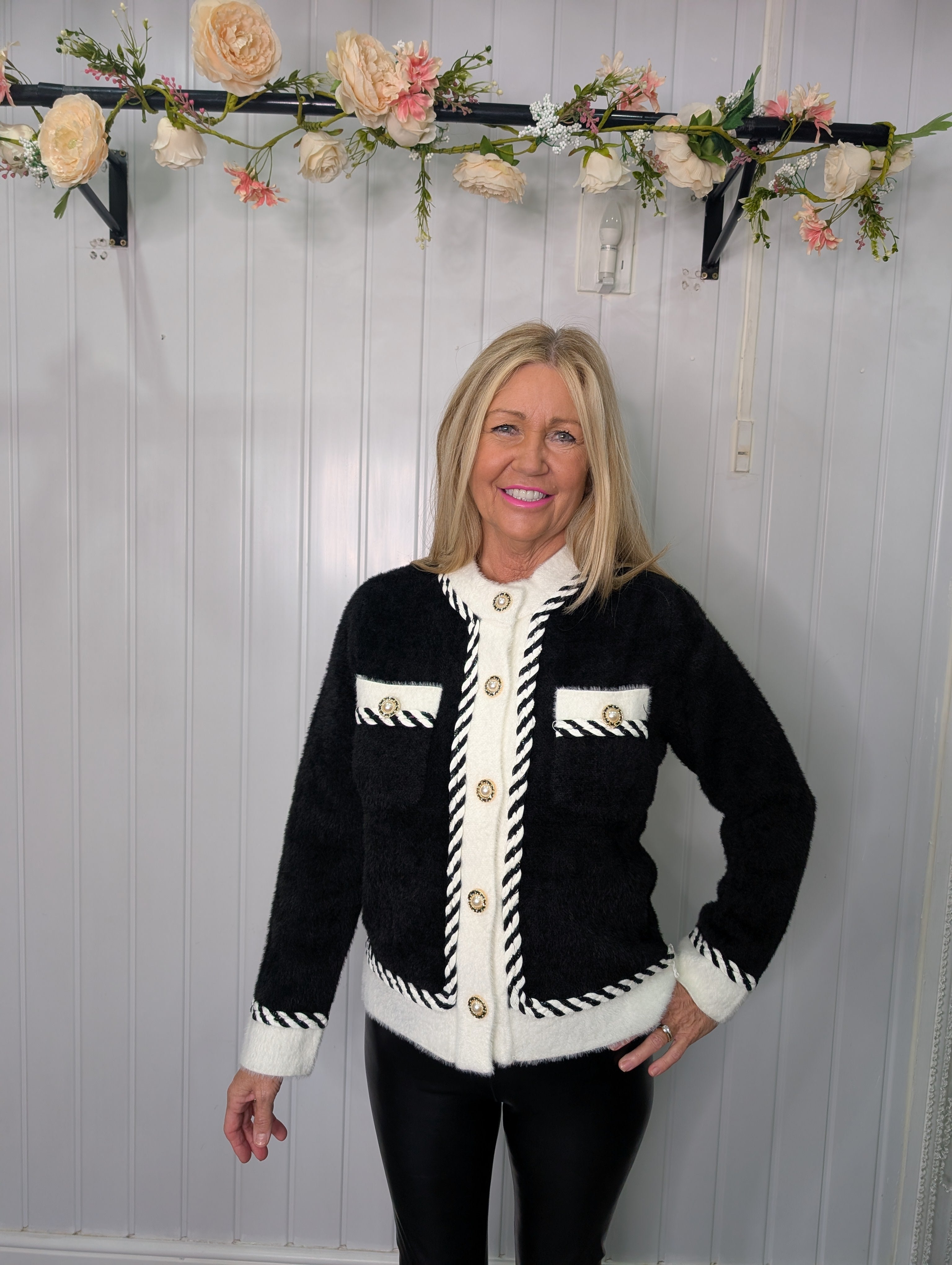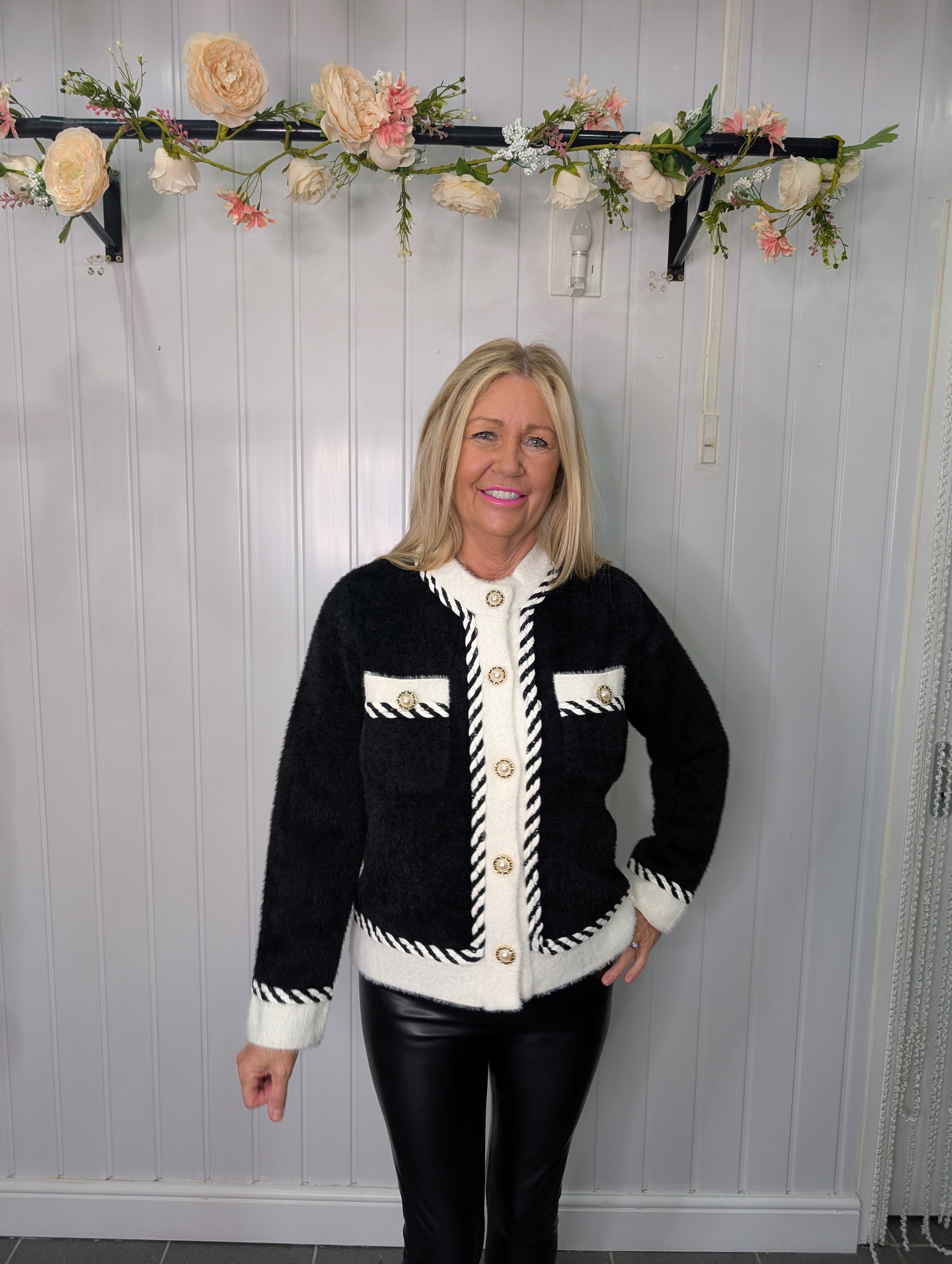 Crafted with a soft knit material and intricately woven, this cardigan adds a touch of elegance to any outfit. Its versatile design allows for effortless styling and its cozy fabric provides comfort all day long. A must-have for a stylish and chic wardrobe. Also available in white, pants available separately