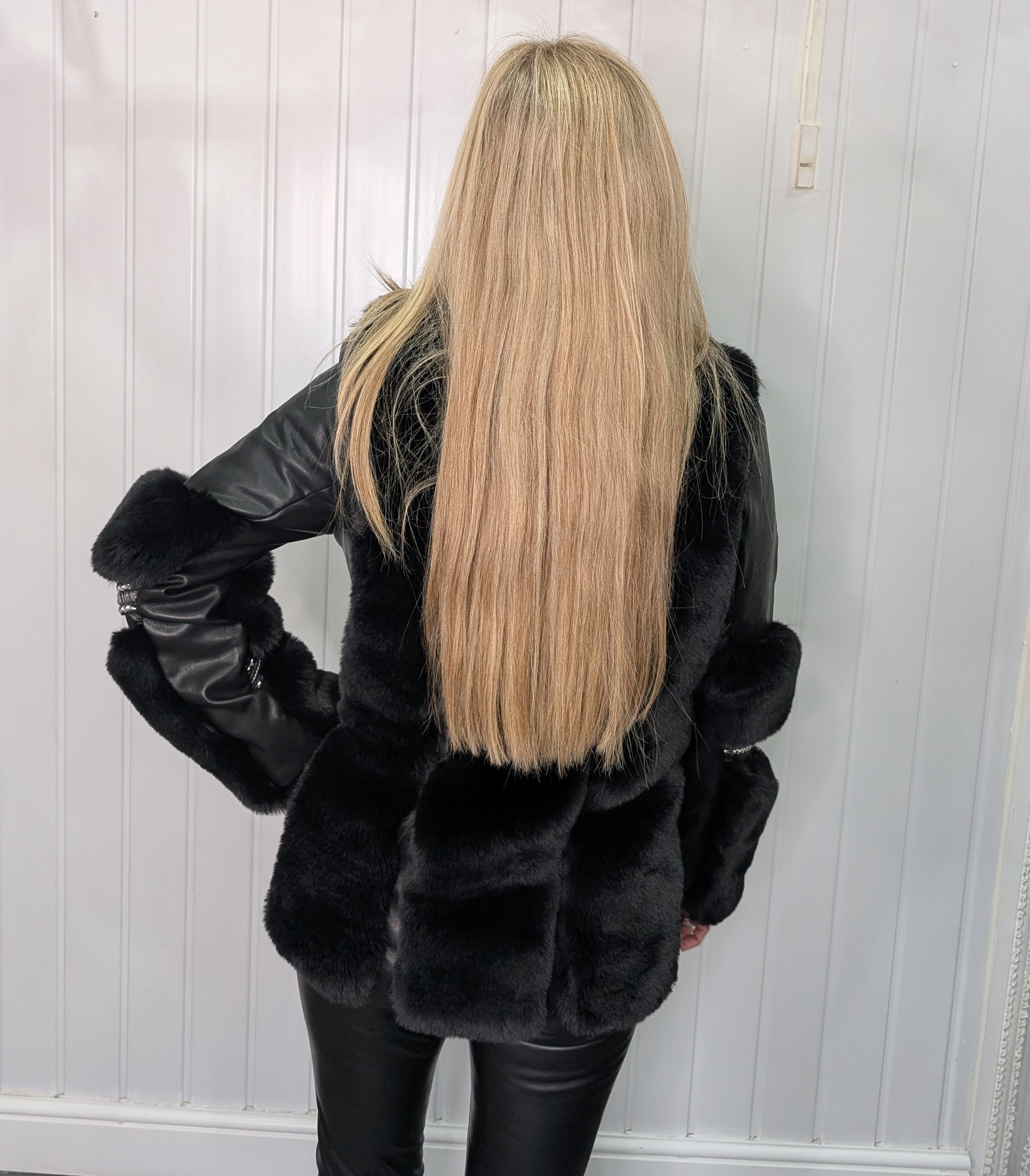 This Faux Fur Coat offers a luxurious and warm addition to your winter wardrobe. Made with high-quality faux fur and silver studded detail it provides both style and comfort for the colder months. The rich black color adds a touch of sophistication to any outfit.