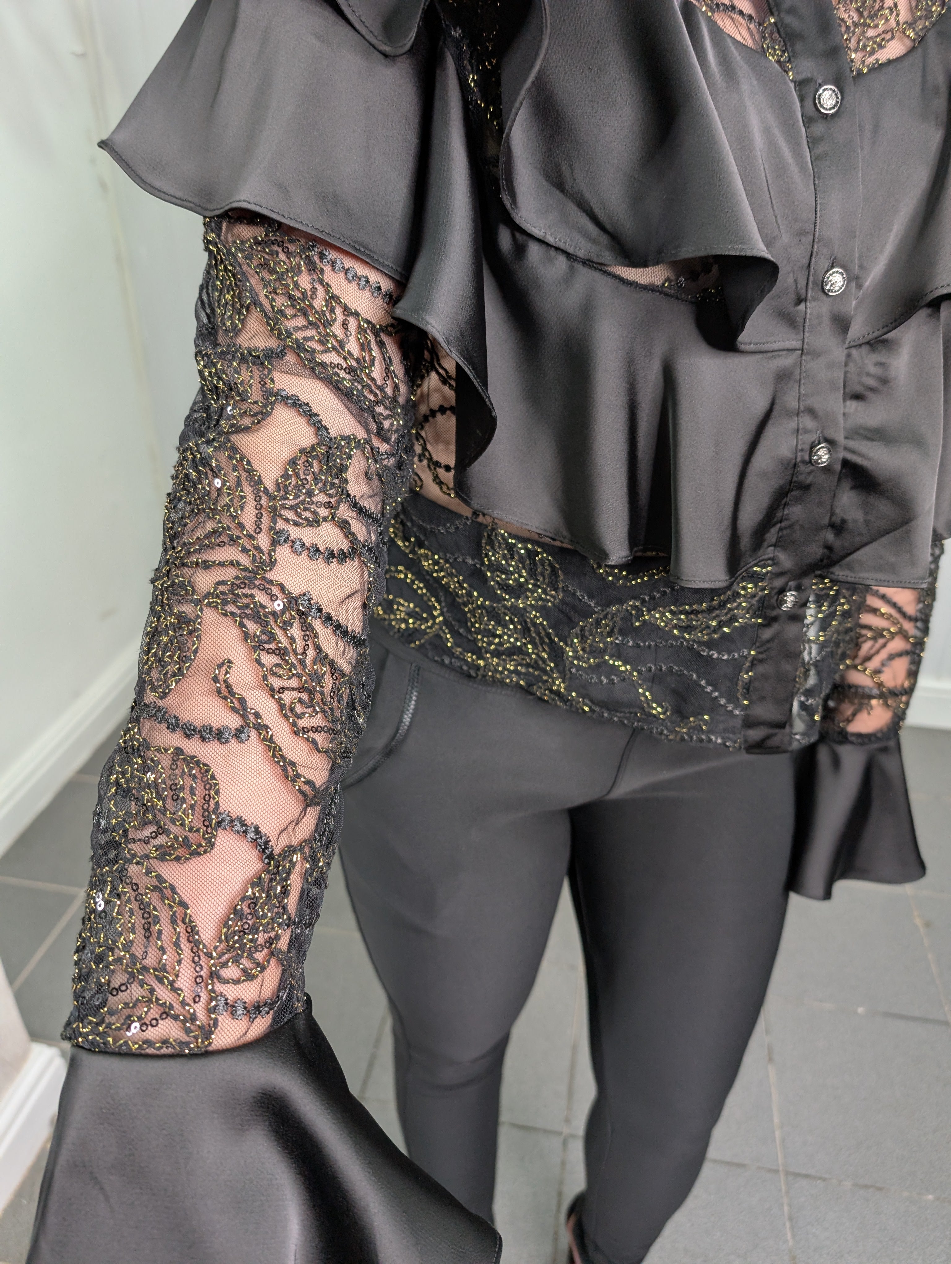 Elevate your evening wardrobe with this sophisticated cream satin shirt, adorned with subtle glitter detailing that catches the light beautifully. The luxurious satin fabric drapes elegantly against the skin, offering a refined sheen perfect for special occasions or upscale casual wear. Designed with a classic silhouette, this piece transitions seamlessly from dinner events to cocktail gatherings. The understated sparkle adds just the right amount of glamour without overwhelming your look, making it an essential investment for those who appreciate timeless style with contemporary flair.