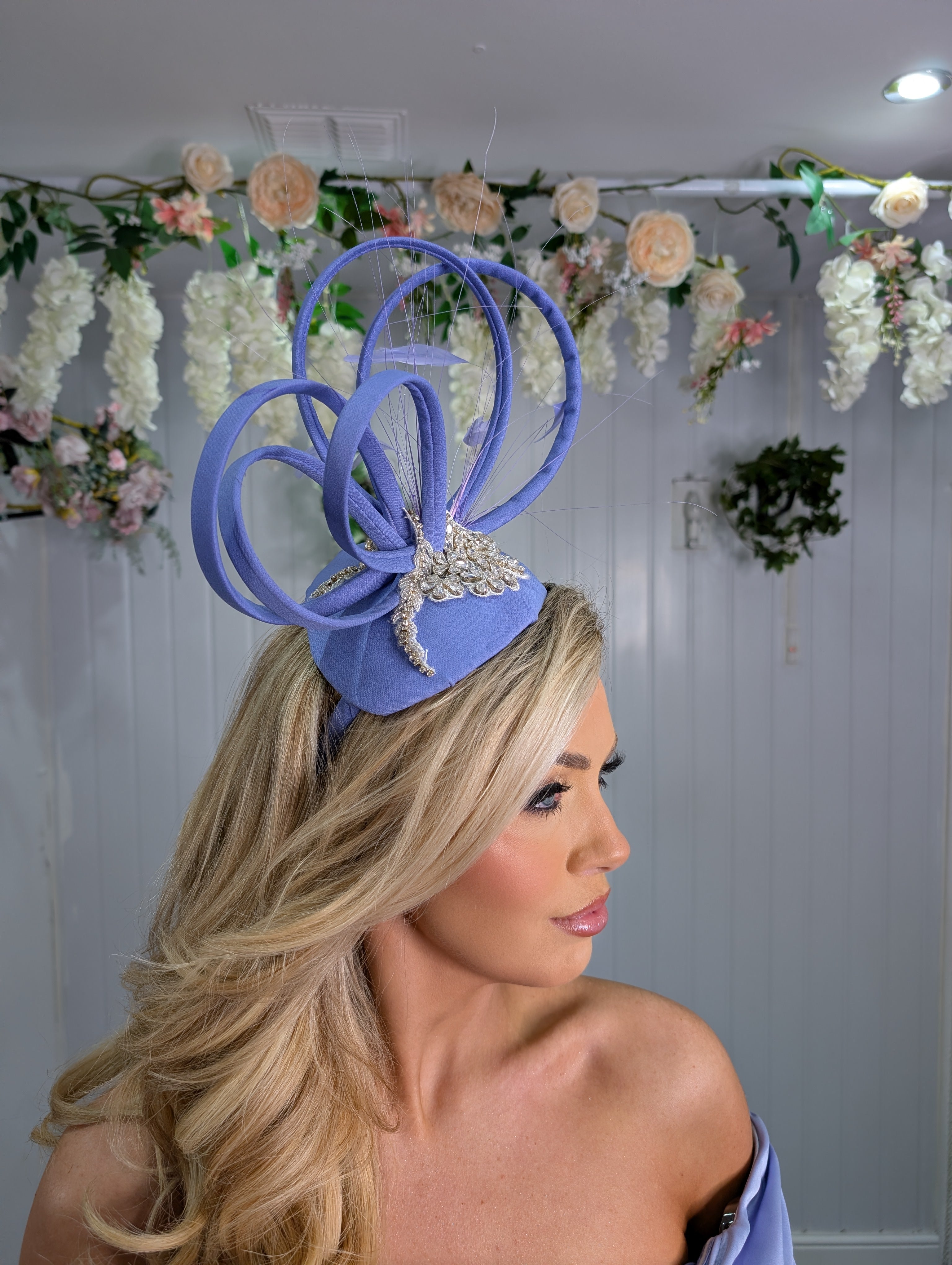 Beautiful handmade to colour coordinate with our lilac beaded midi dress. The loops are made from the same material as the dress with pink and silver beads, adorned with feathers. Setting on a elastic which you can't see in your hair also a clip.