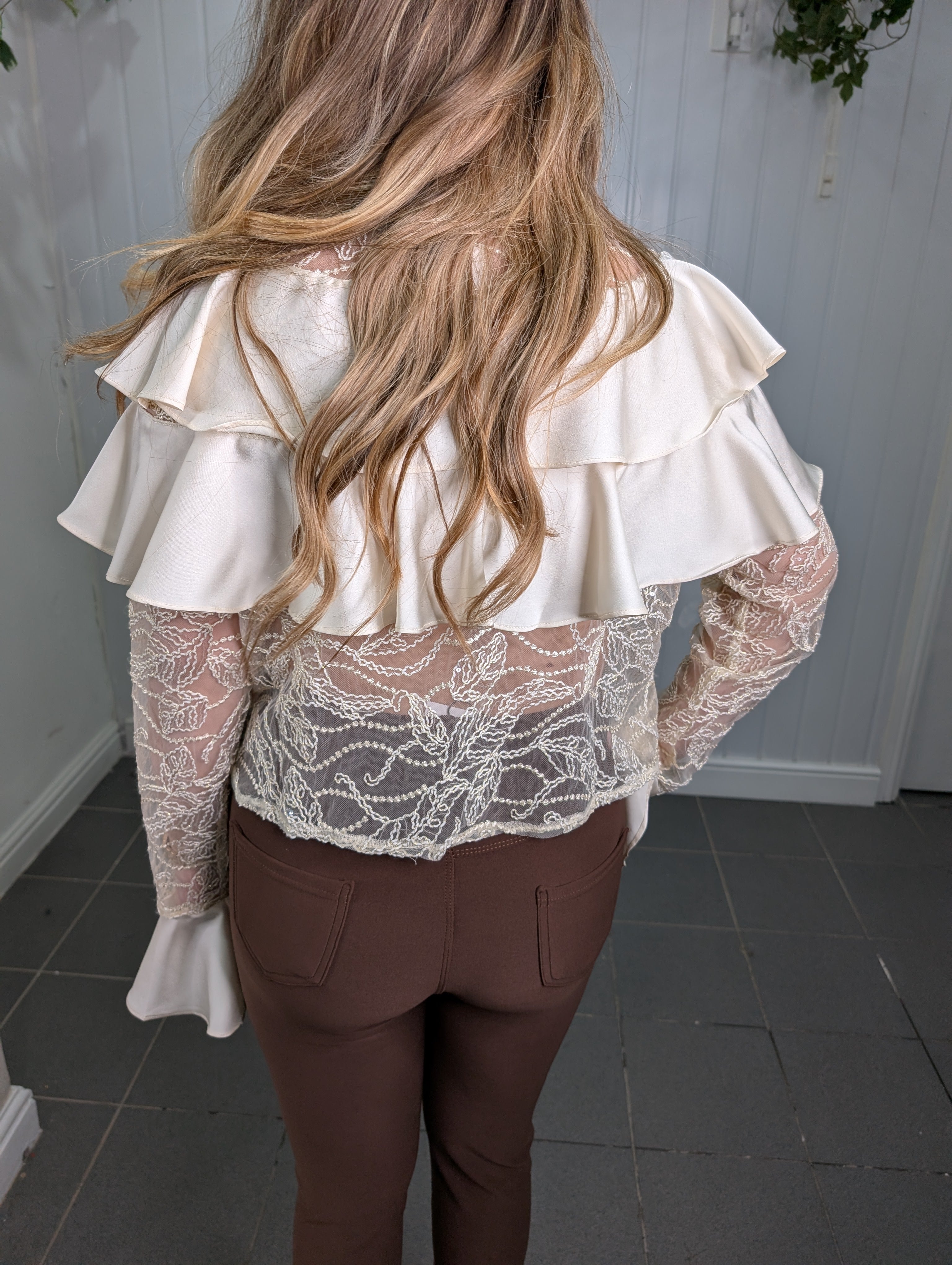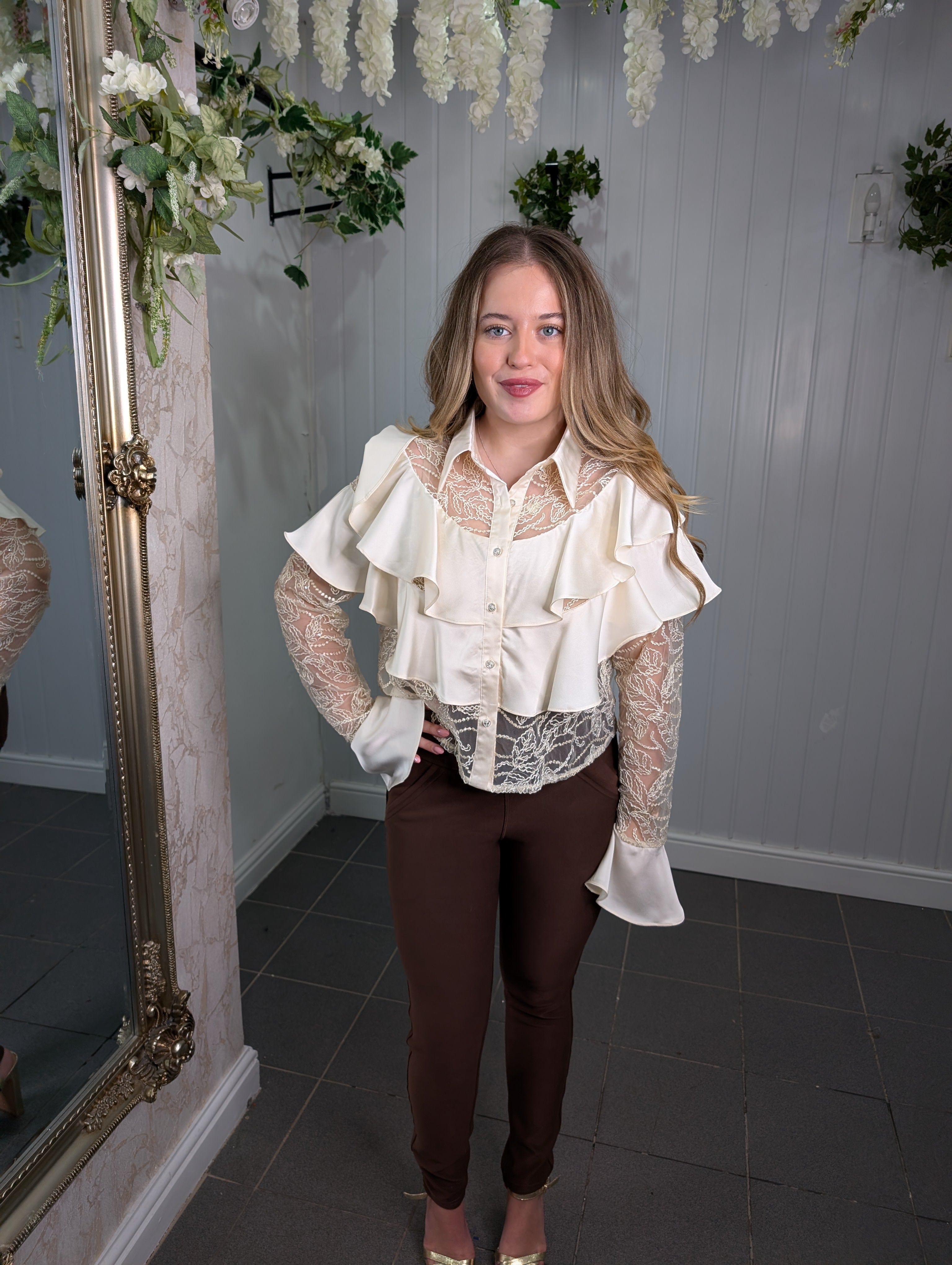 Elevate your evening wardrobe with this sophisticated cream satin shirt, adorned with subtle glitter detailing that catches the light beautifully. The luxurious satin fabric drapes elegantly against the skin, offering a refined sheen perfect for special occasions or upscale casual wear. Designed with a classic silhouette, this piece transitions seamlessly from dinner events to cocktail gatherings. The understated sparkle adds just the right amount of glamour without overwhelming your look, making it an essential investment for those who appreciate timeless style with contemporary flair.