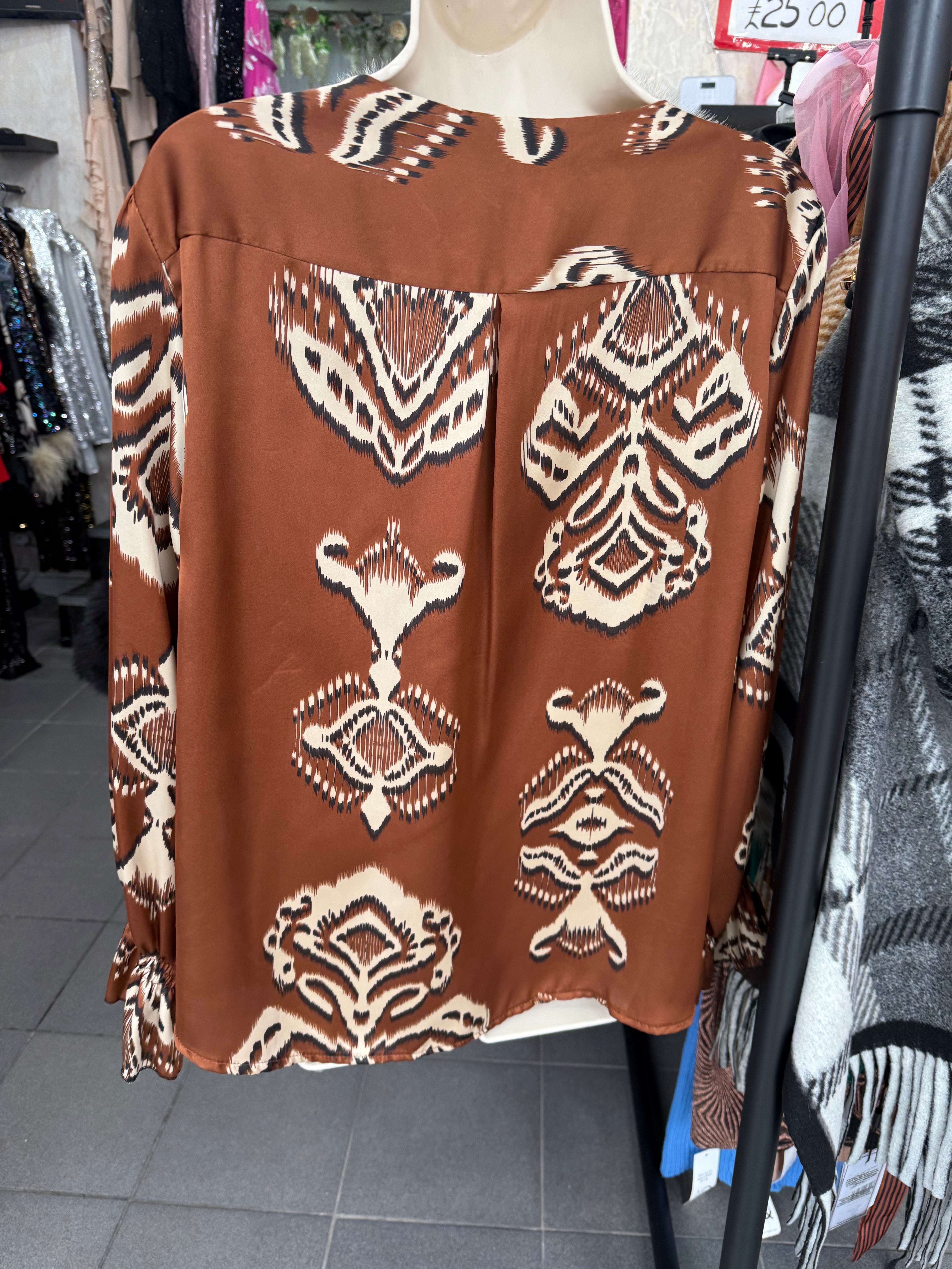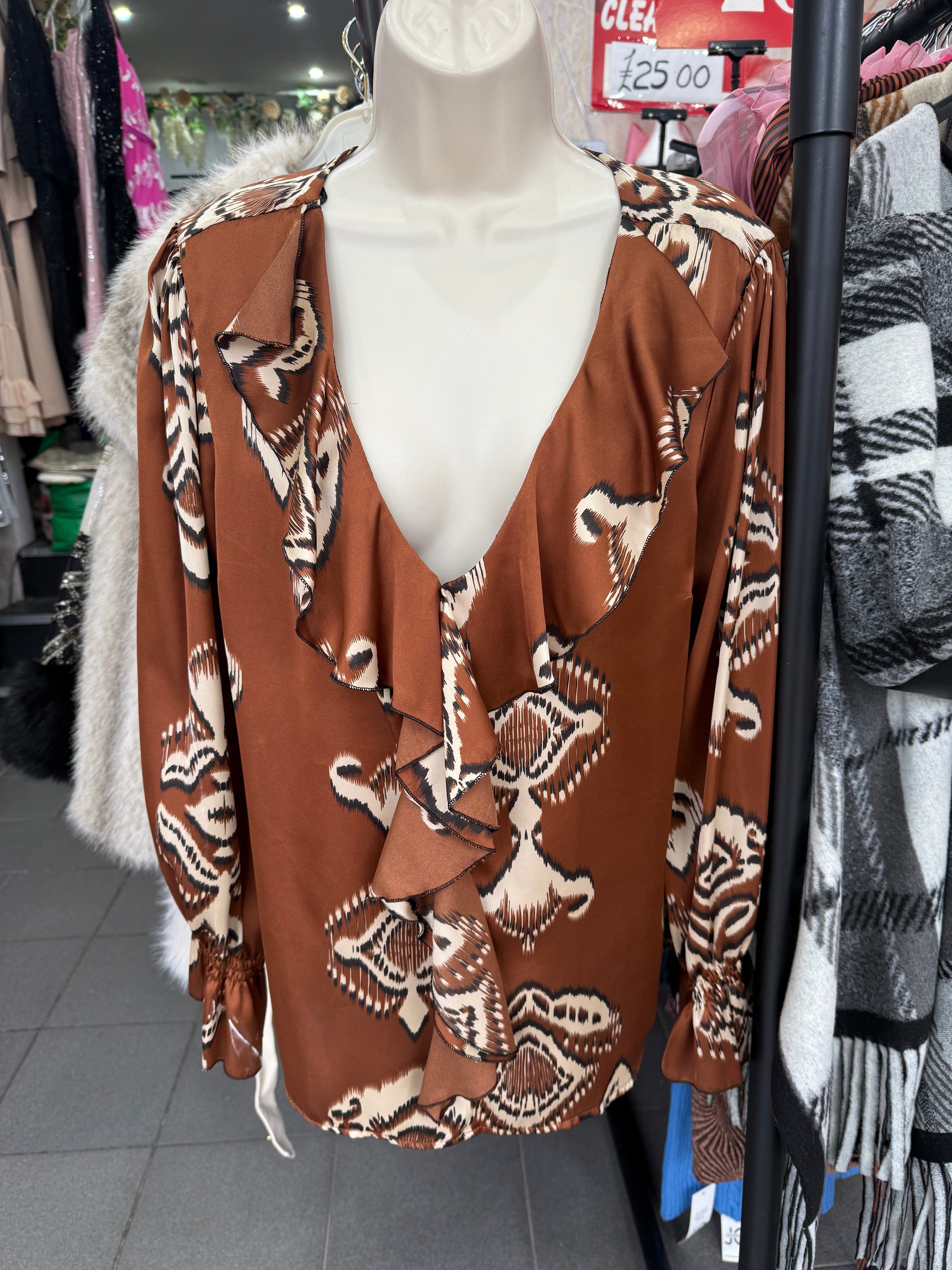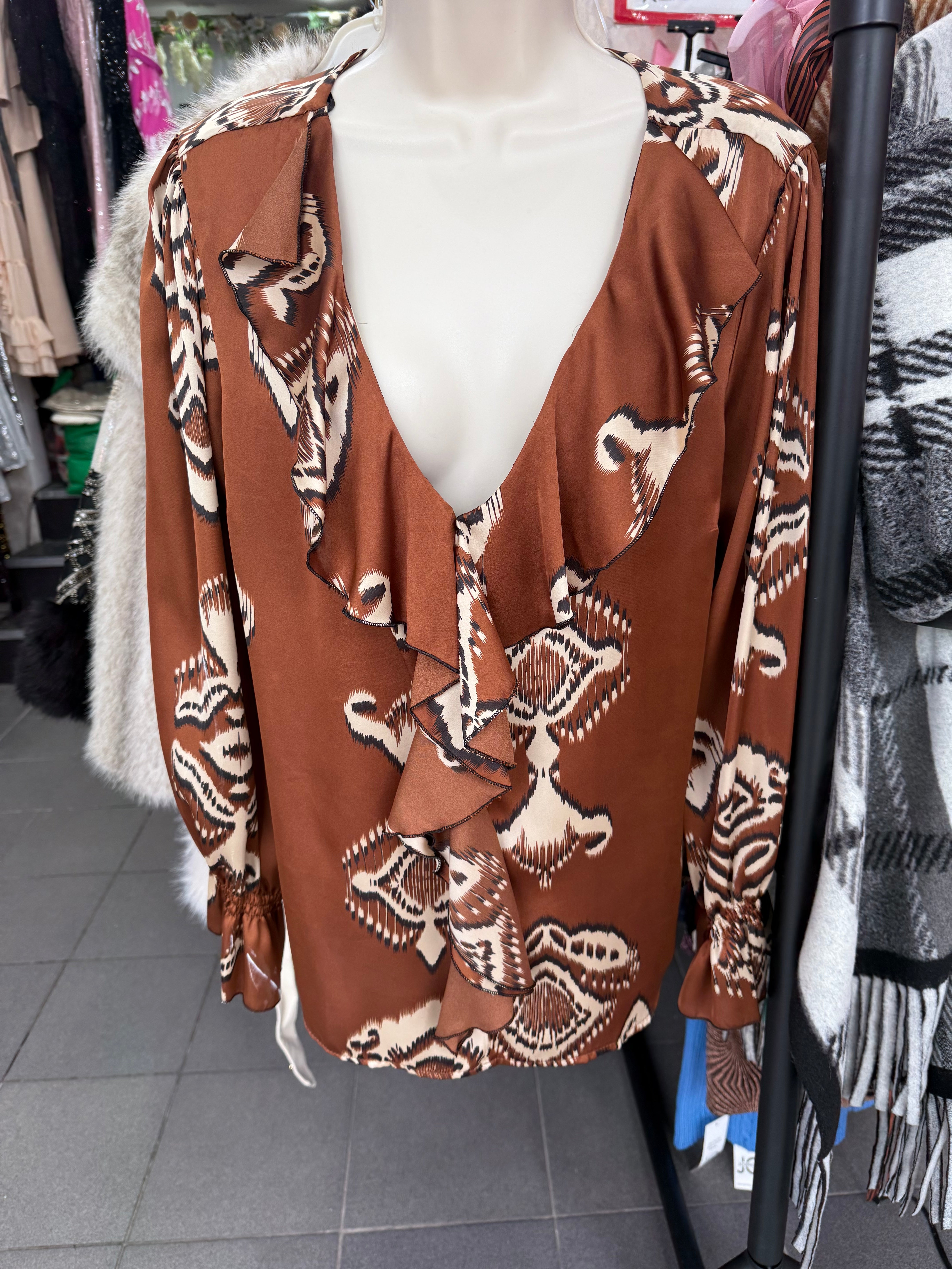 Introducing the Jeff Gallano Brown And Cream Frill Top. Made from lightweight satin material, this top offers a luxurious feel and a flattering fit. Perfect for any occasion, its frill detailing adds a touch of elegance to your wardrobe. Upgrade your style with this versatile piece.