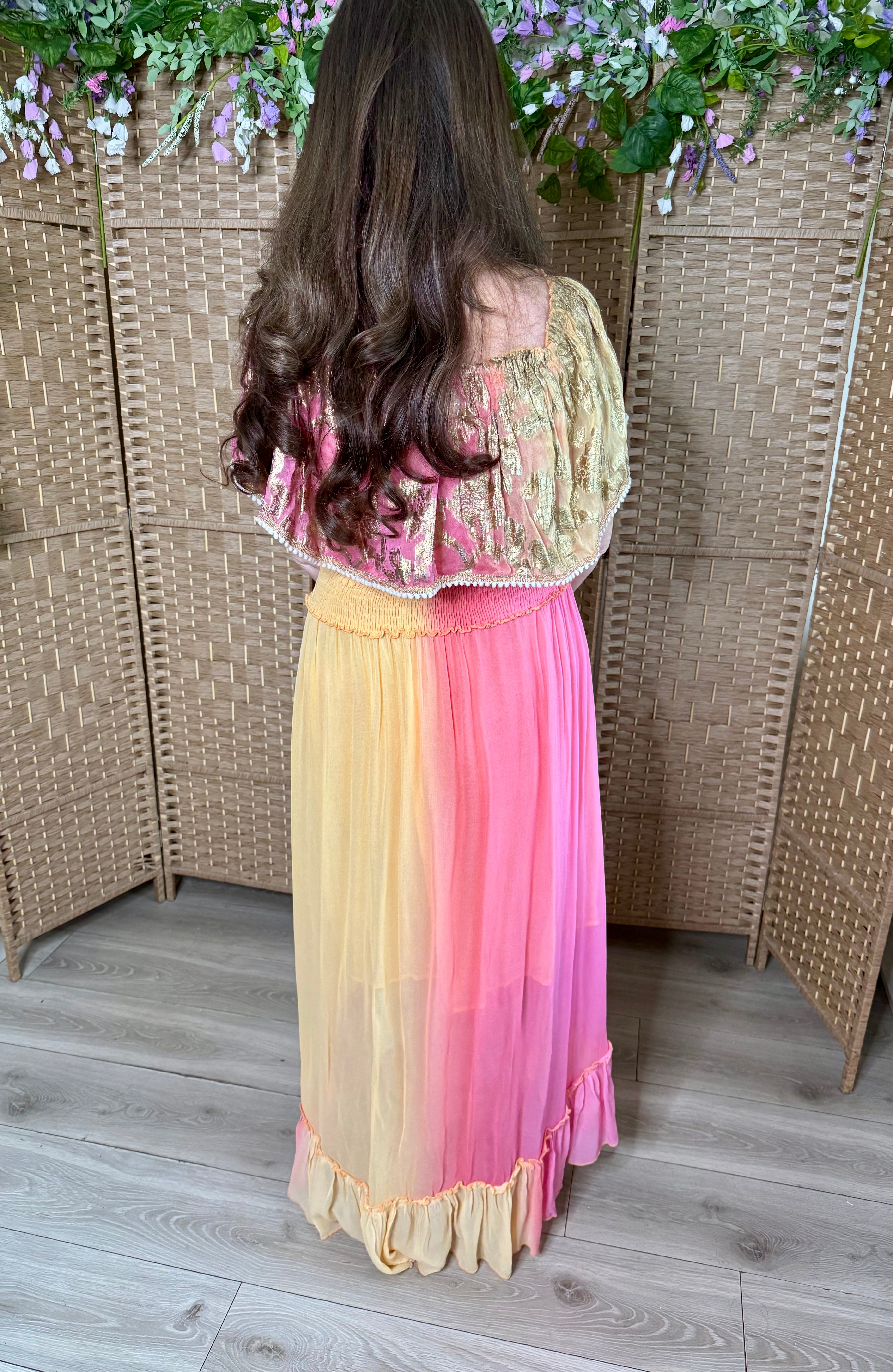 The Orange and Pink Foil Hi Low Dress features an elasticated waist for adjustable comfort and can be worn on or off the shoulder, providing versatility. This design allows for ease of movement while maintaining...