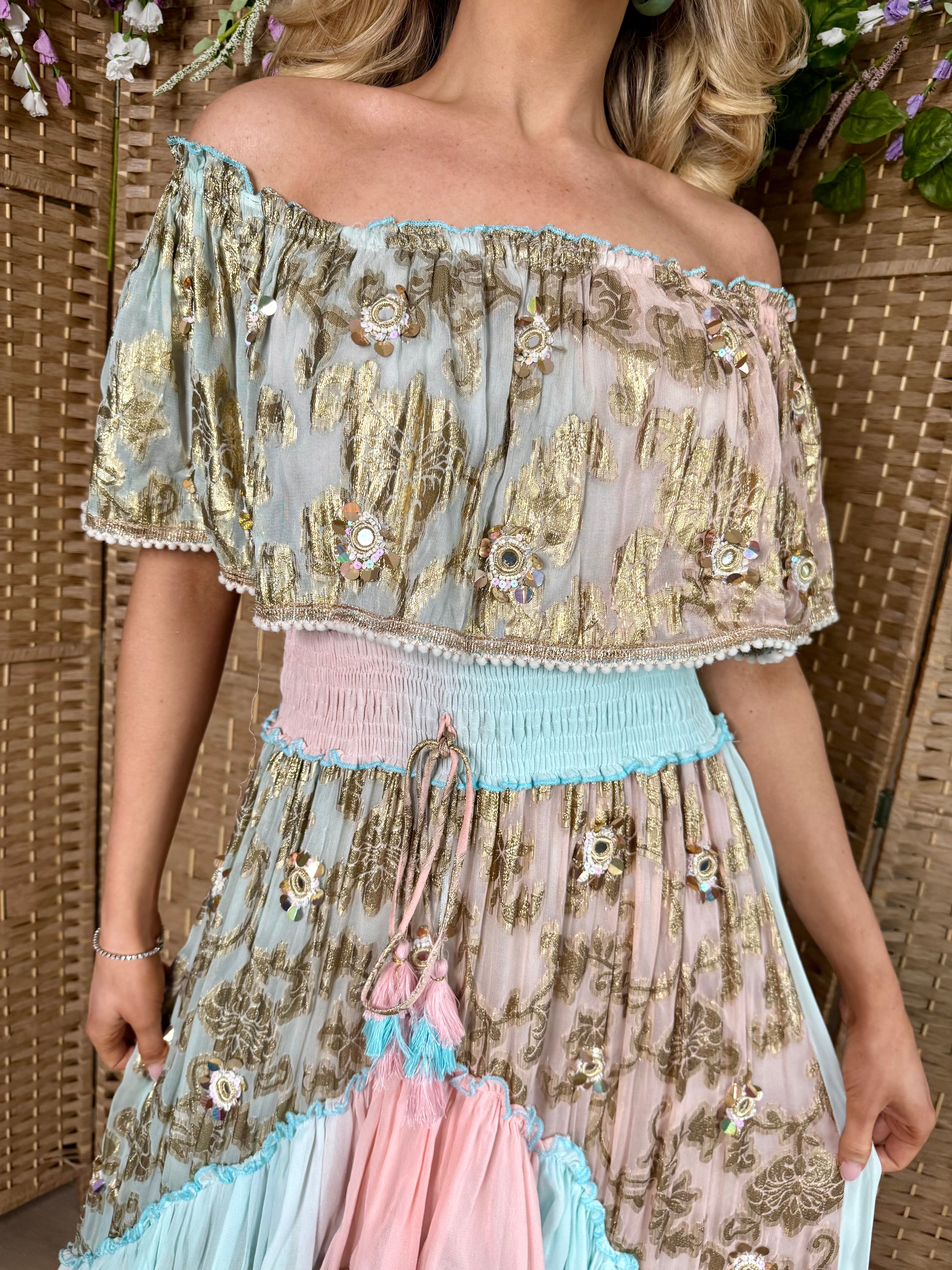 The Pink And Mint Foil Hi Low Dress features an elasticated waist for adjustable comfort and can be worn on or off the shoulder, providing versatility. This design allows for ease of movement while maintaining a sophisticated silhouette, making it suitable for various occasions.
