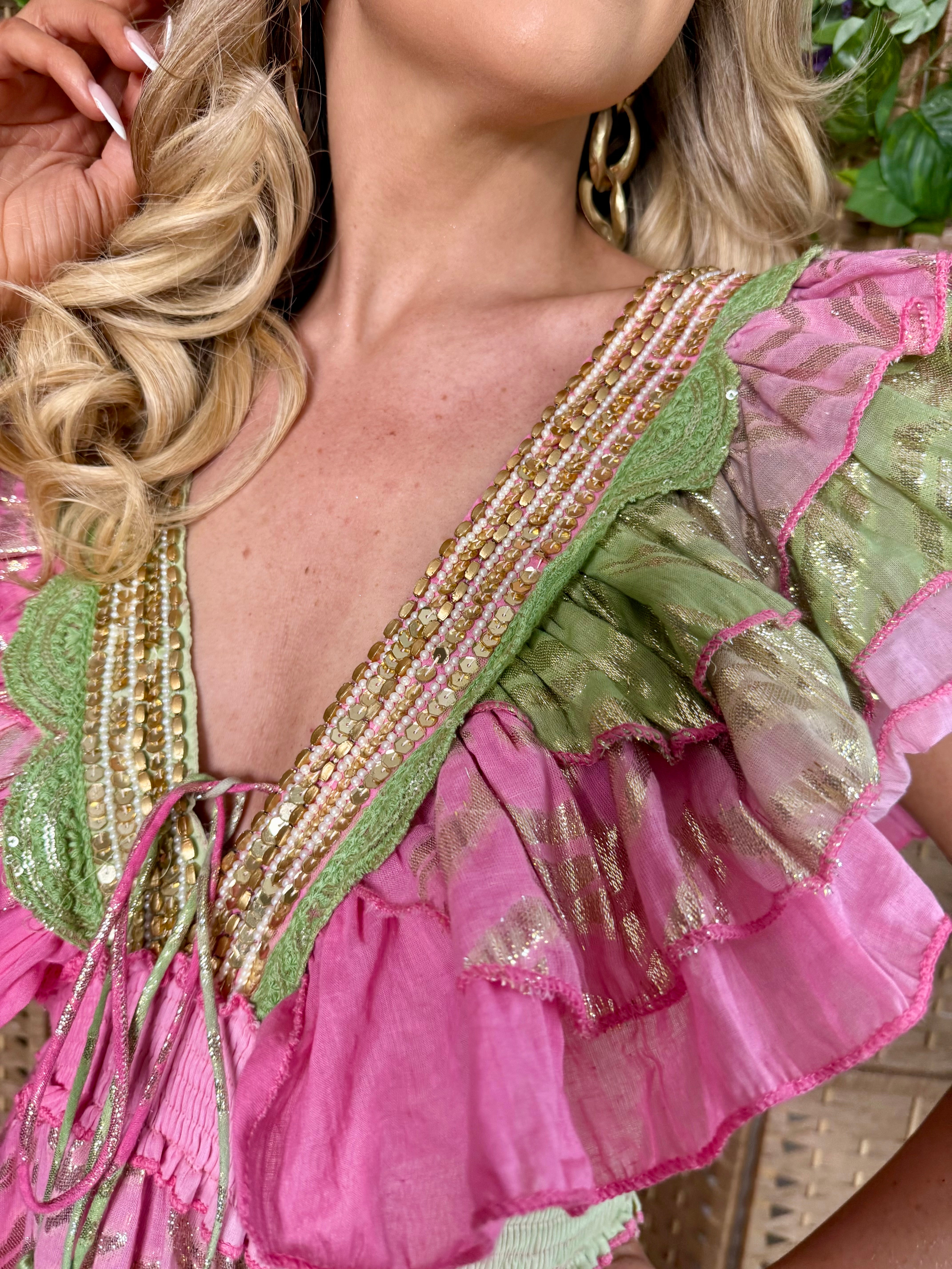 Pink/Green Foil Beaded Mini Dress