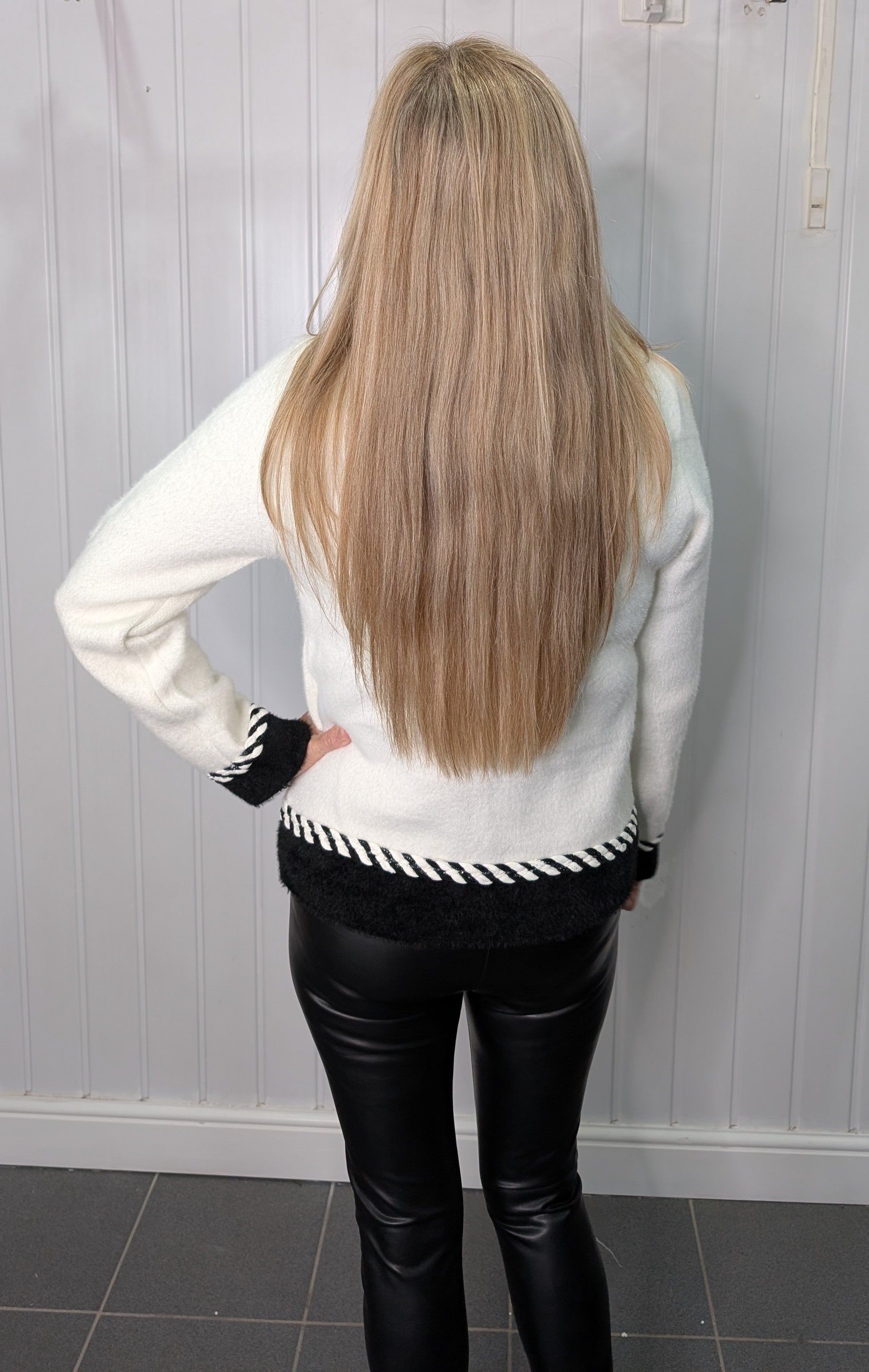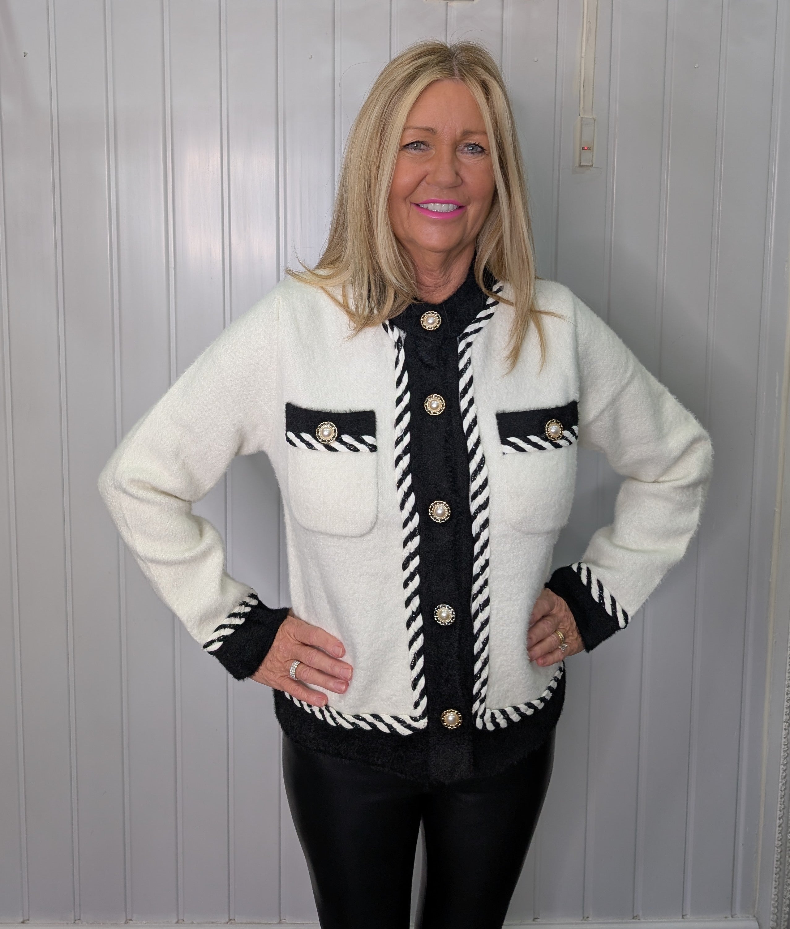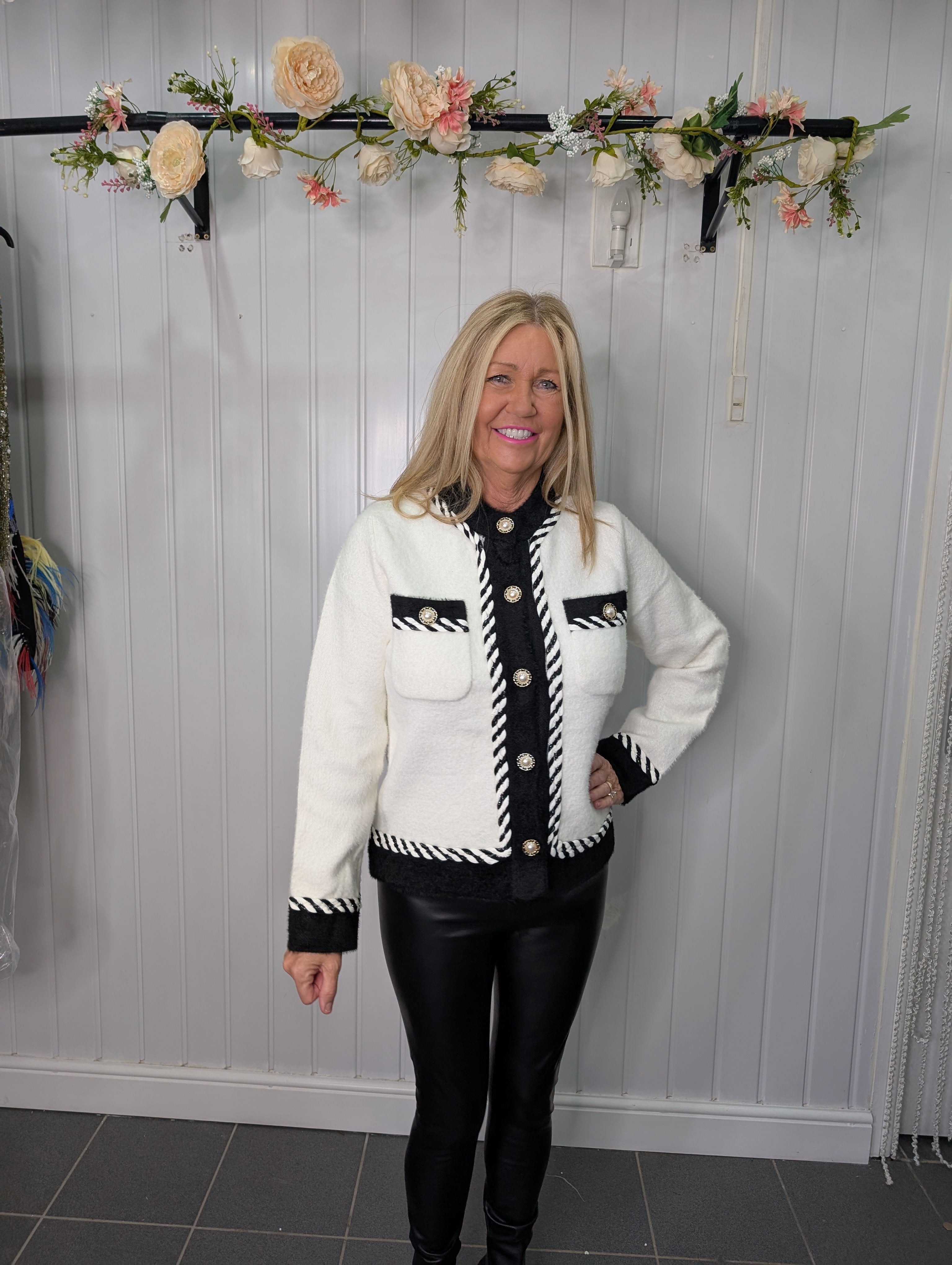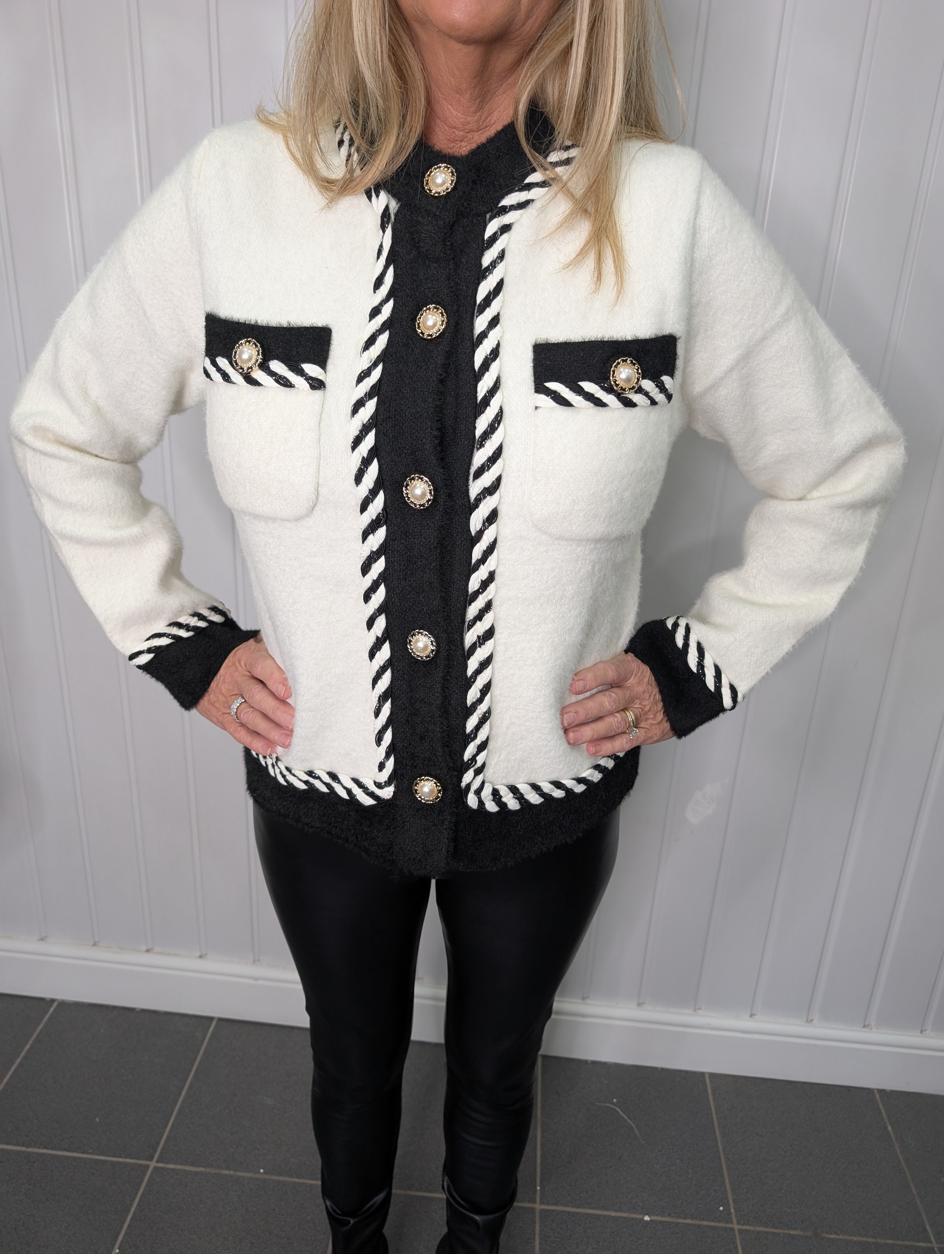 Crafted with a soft knit material and intricately woven, this cardigan adds a touch of elegance to any outfit. Its versatile design allows for effortless styling and its cozy fabric provides comfort all day long. A must-have for a stylish and chic wardrobe. Also available in white, pants available separately
